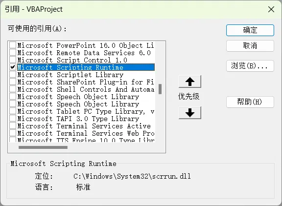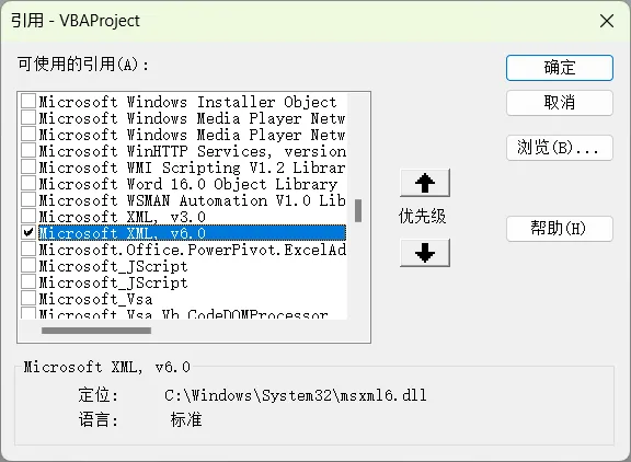 击【工具】→【引用】,勾选Microsoft XML, v6.0(用于HTTP请求)和Microsoft Scripting Runtime(用于JSON解析);