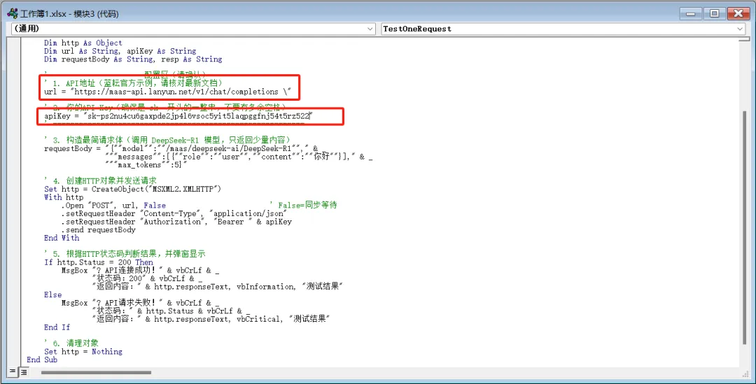 我给大家分享一个检测代码,大家可以直接粘贴进去进行API接口是否连接的检测。完整VBA代码(最简请求测试)