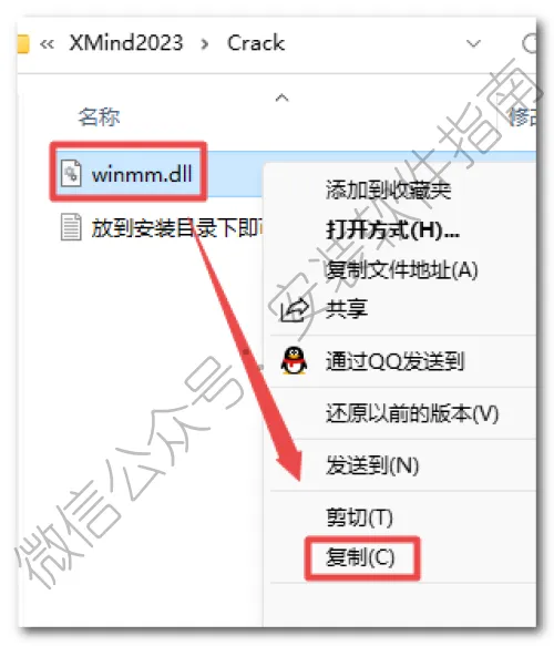 7、返回之前解压的“XMind2023”文件夹,双击打开“Crack”文件夹,选中“winmm.dll”文件,鼠标右键选择“复制”
