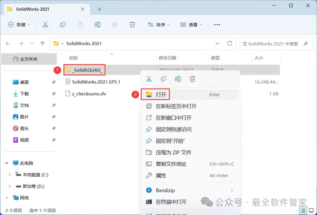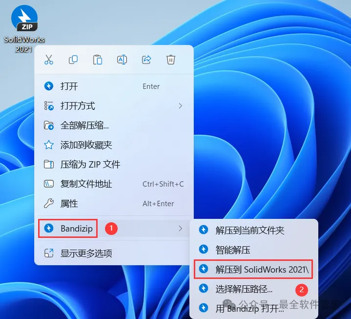 1、下载SolidWorks 2021软件安装包到电脑上,右键选择【解压到SolidWorks 2021\】