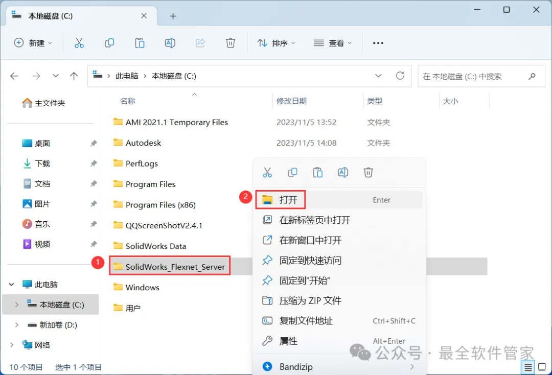 9、找到粘贴的【SolidWorks_Flexnet_Server】文件夹,右键【打开】它