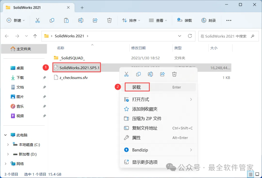 13、回到SolidWorks 2021文件夹,找到【SolidWorks.2021.SP5】文件,再右键点击【装载】