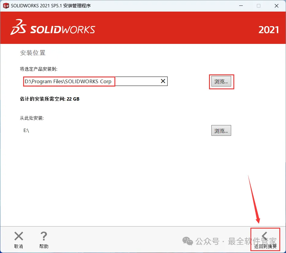 19、软件默认安装在C盘,可自定义更改软件安装位置,这里小编选择安装在D盘;点击【返回到摘要】