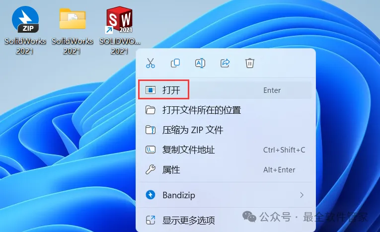 30、回到桌面,右键桌面上的【SolidWorks 2021软件图标】,点击【打开】