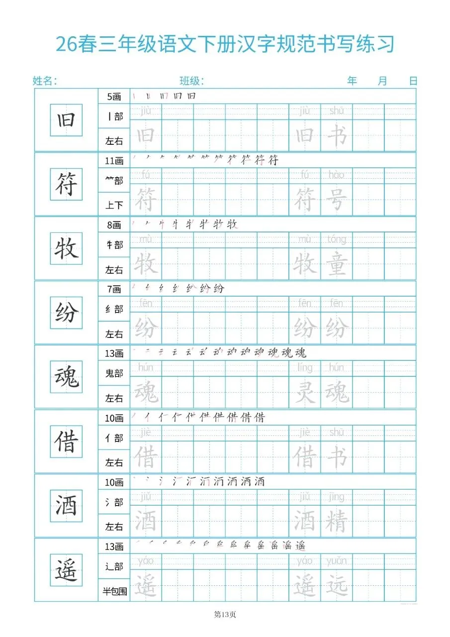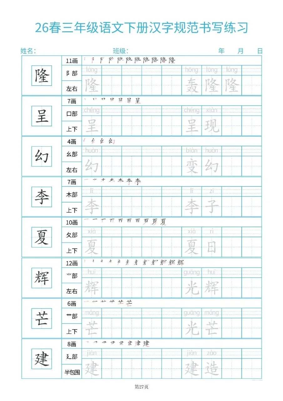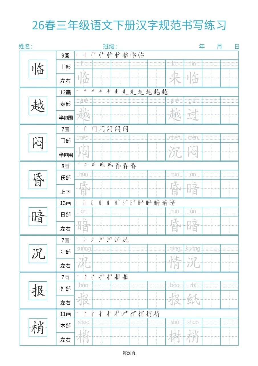 26年春人教版三年级下册语文(写字表同步生字帖),共32页,电子版可下载可打印,这份三下语文生字描红练字帖,涵盖了语文课本中必须掌握的一类生字,让孩子在临摹中熟写所学生字及拼音,为三年级的语文学习奠定基础。需要的家长抓紧打印出来,让孩子练一练吧!