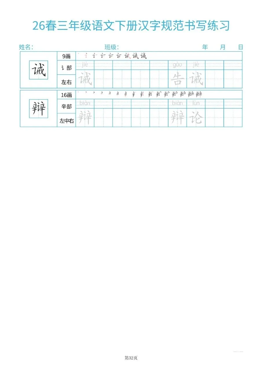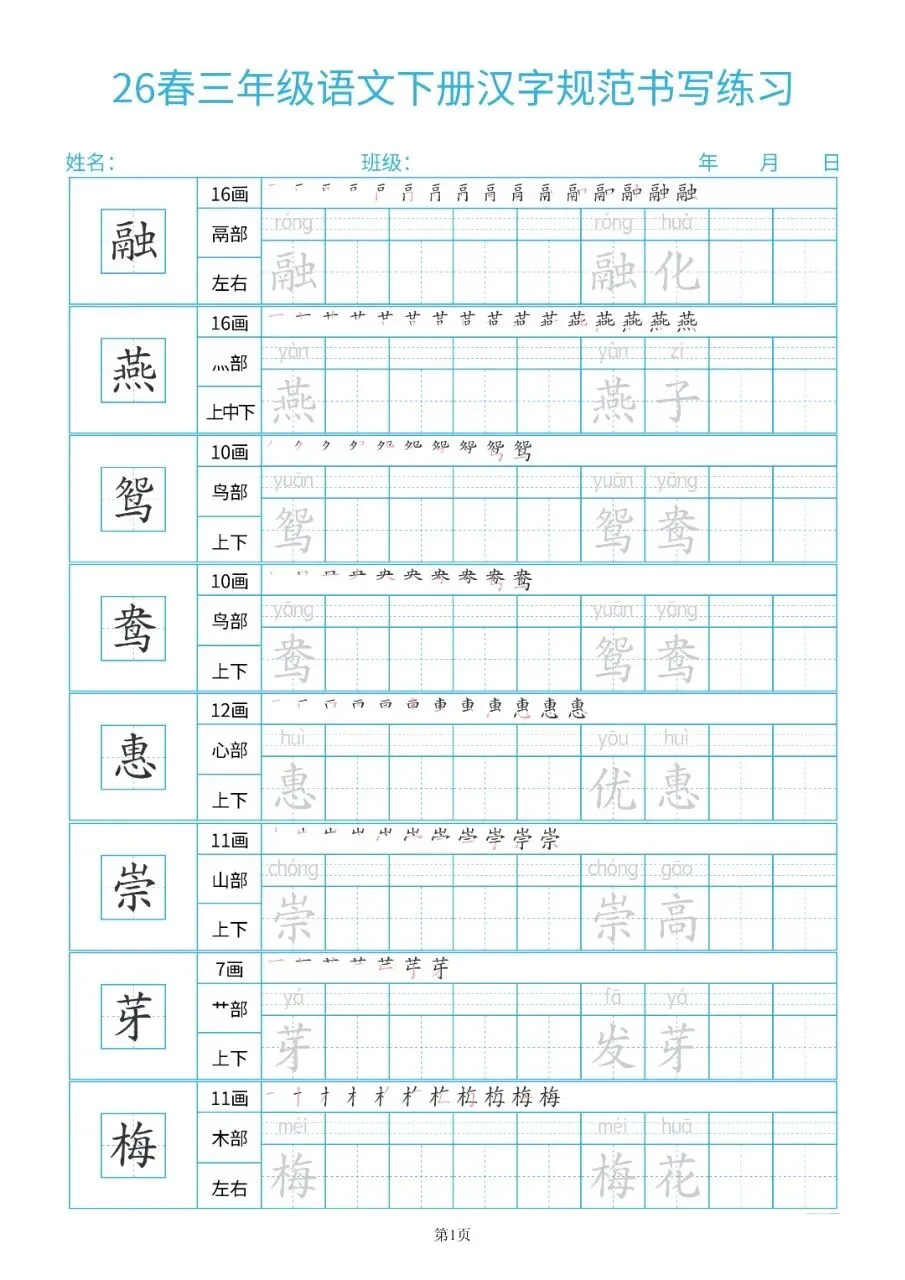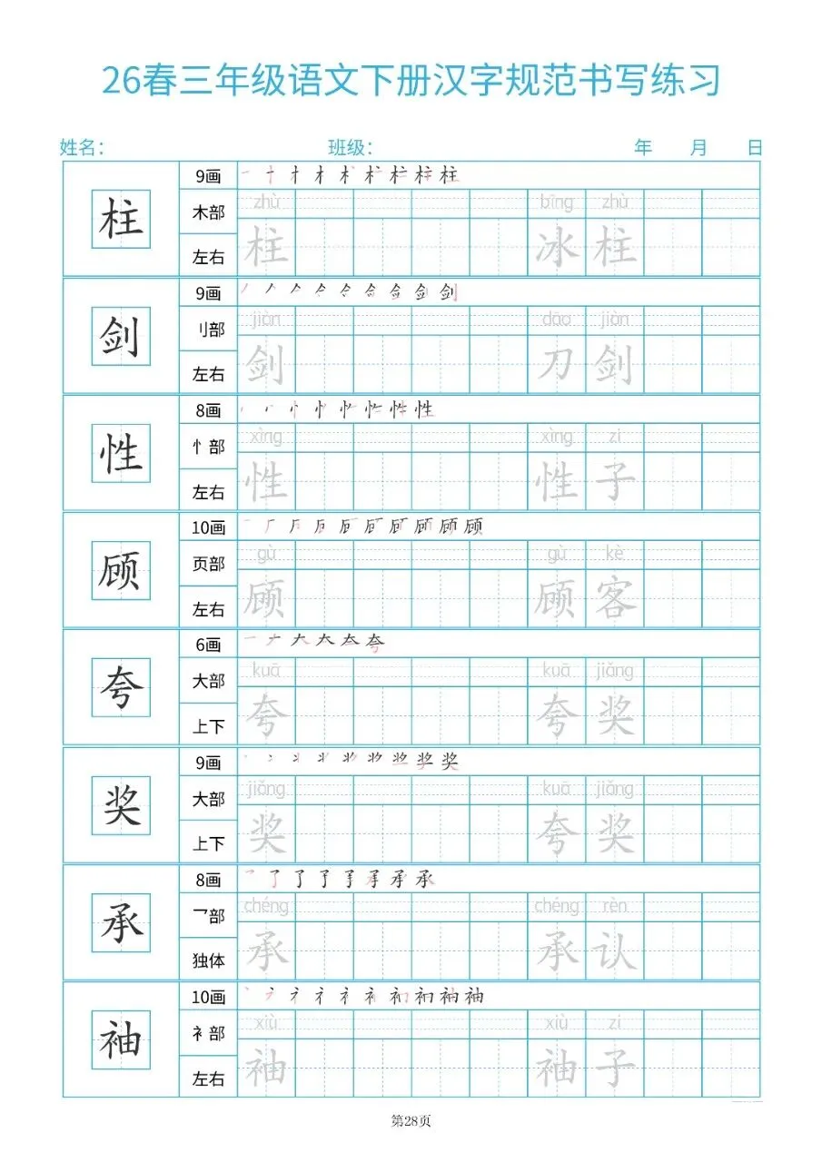 26年春人教版三年级下册语文(写字表同步生字帖),共32页,电子版可下载可打印,这份三下语文生字描红练字帖,涵盖了语文课本中必须掌握的一类生字,让孩子在临摹中熟写所学生字及拼音,为三年级的语文学习奠定基础。需要的家长抓紧打印出来,让孩子练一练吧!