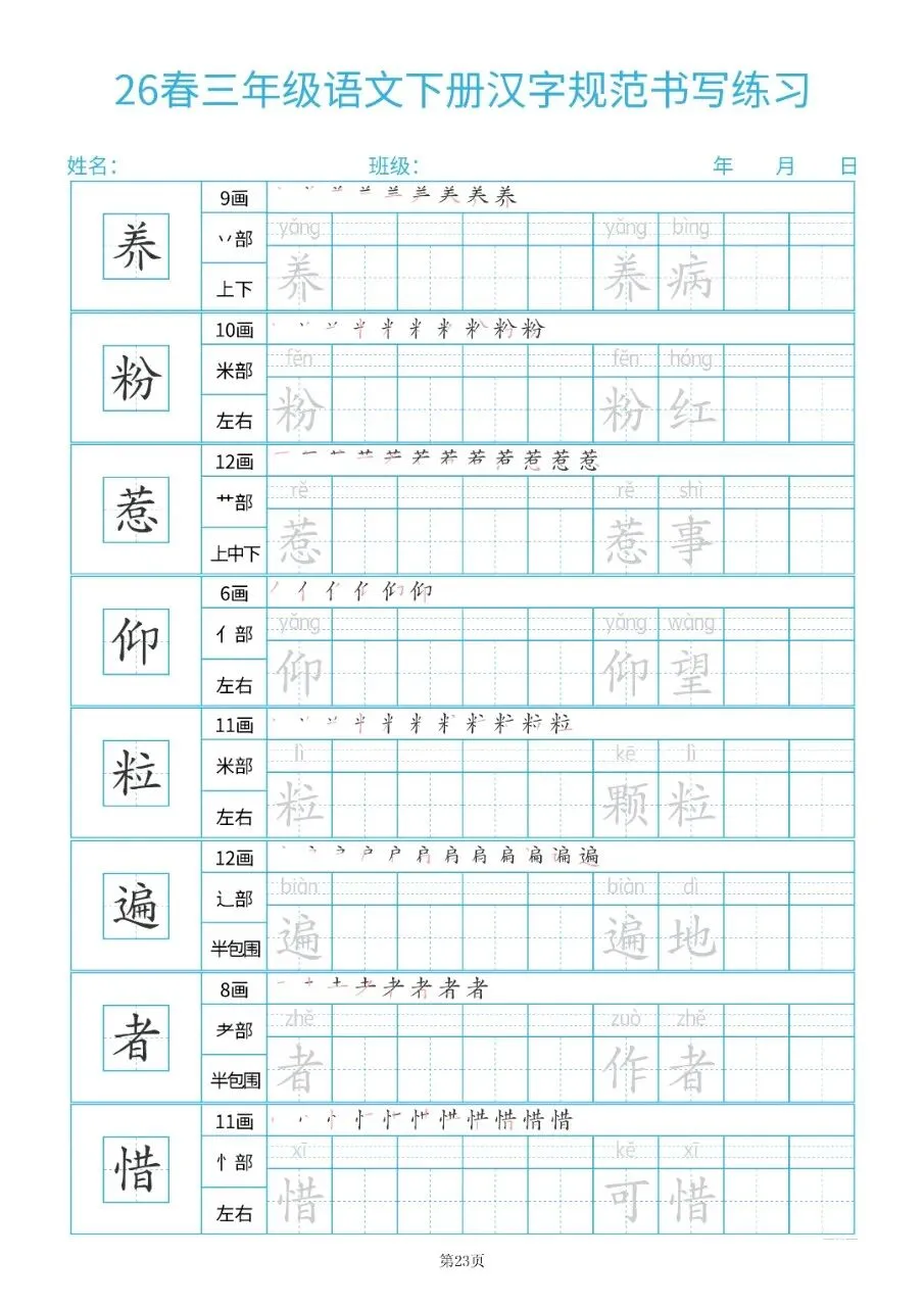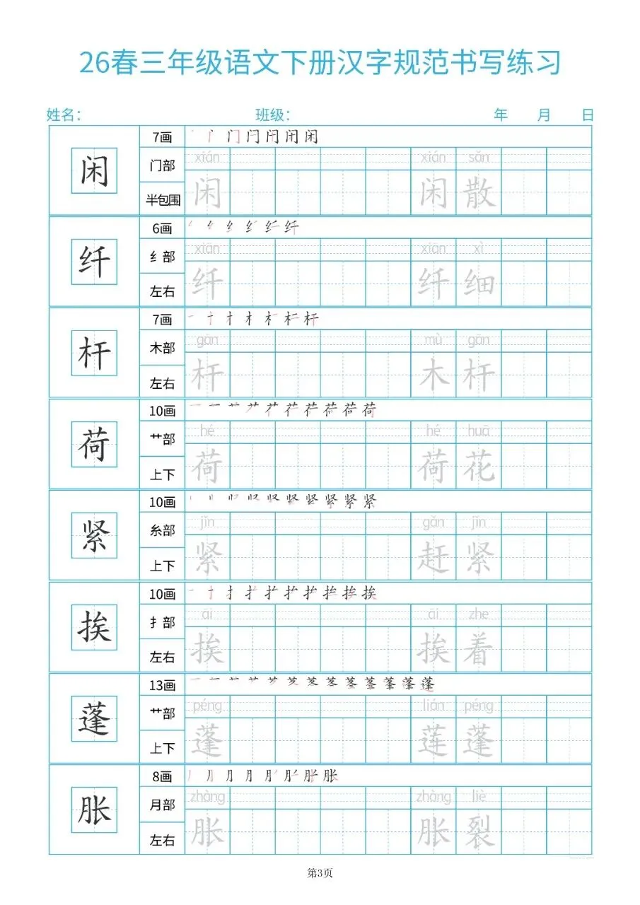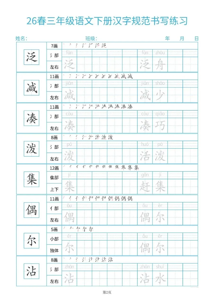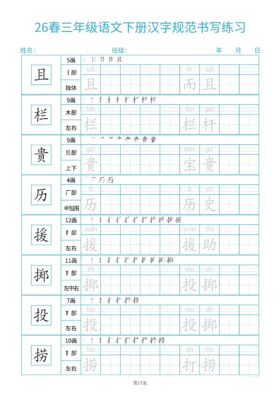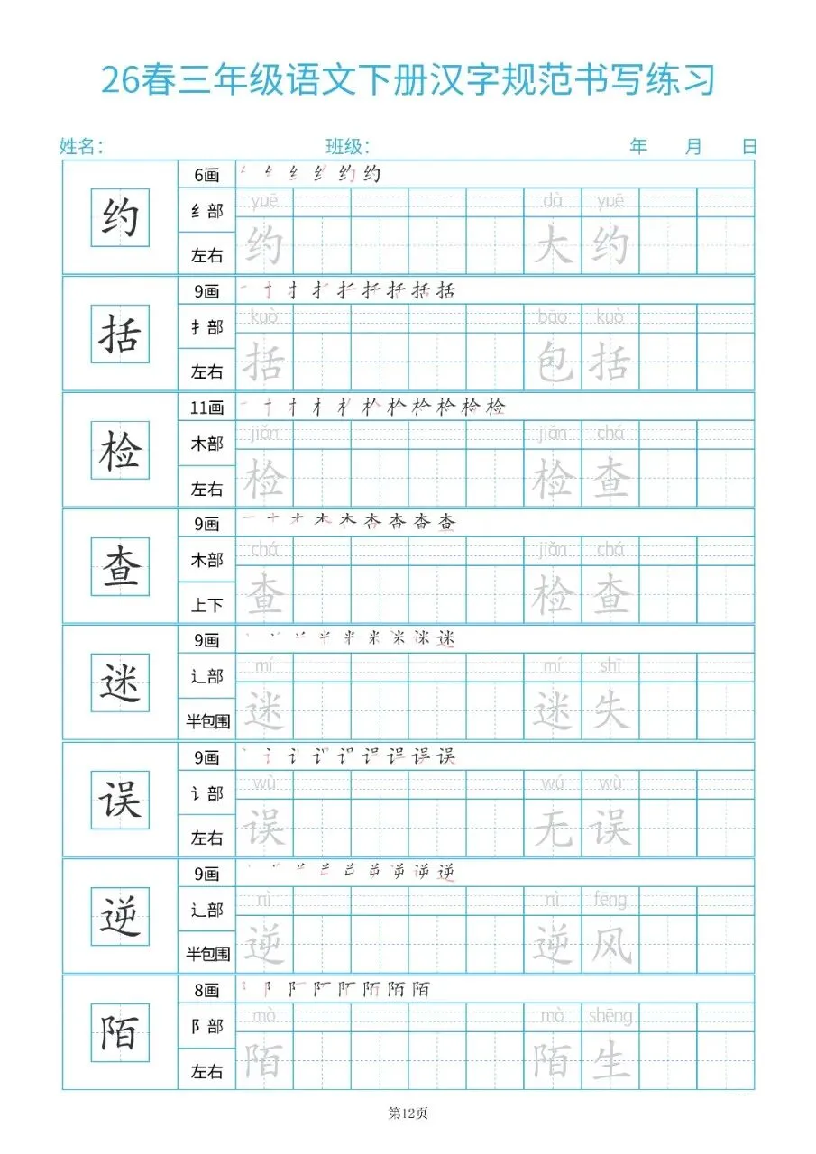 三年级必看!新版下册语文写字表字帖,电子版打印帮孩子规范书写.