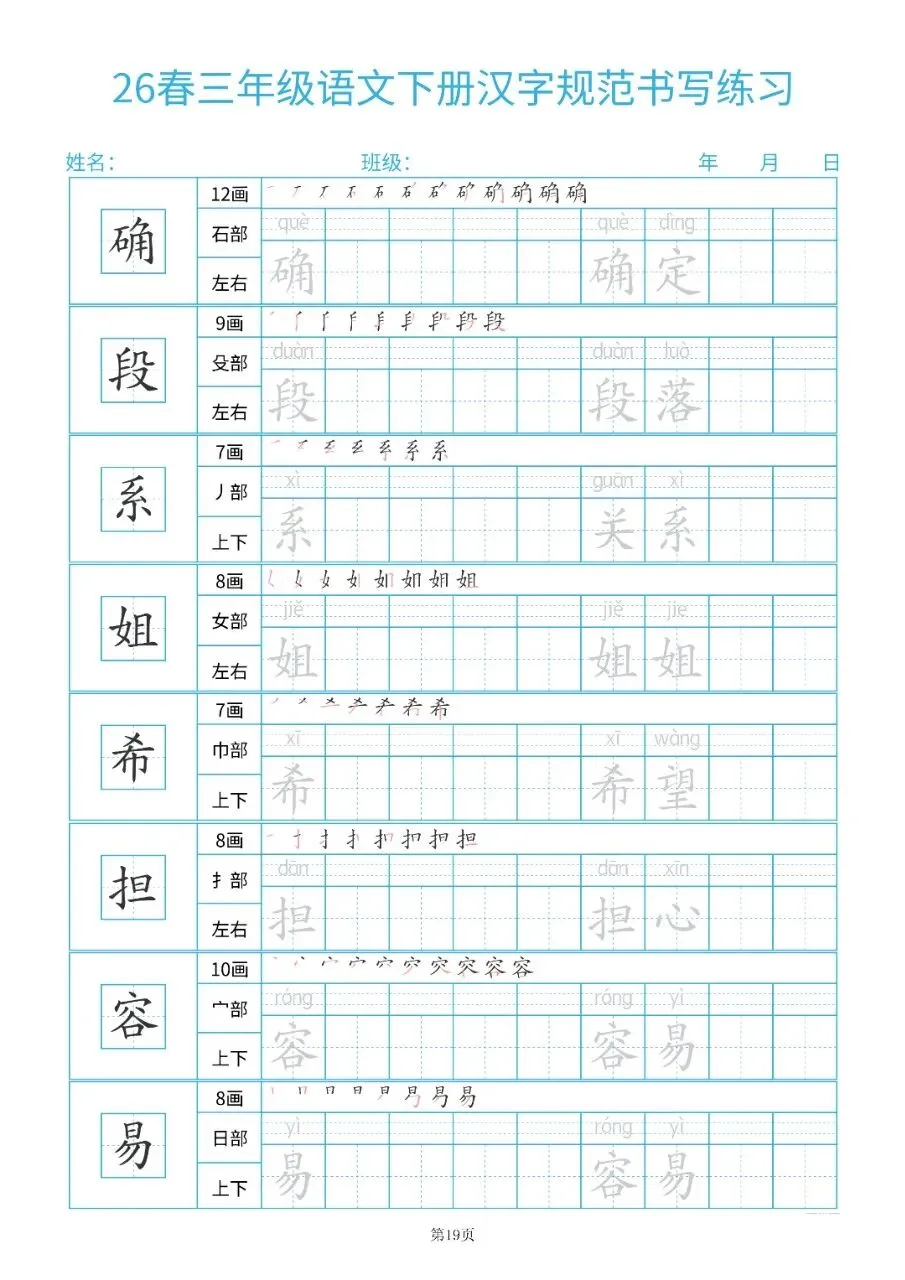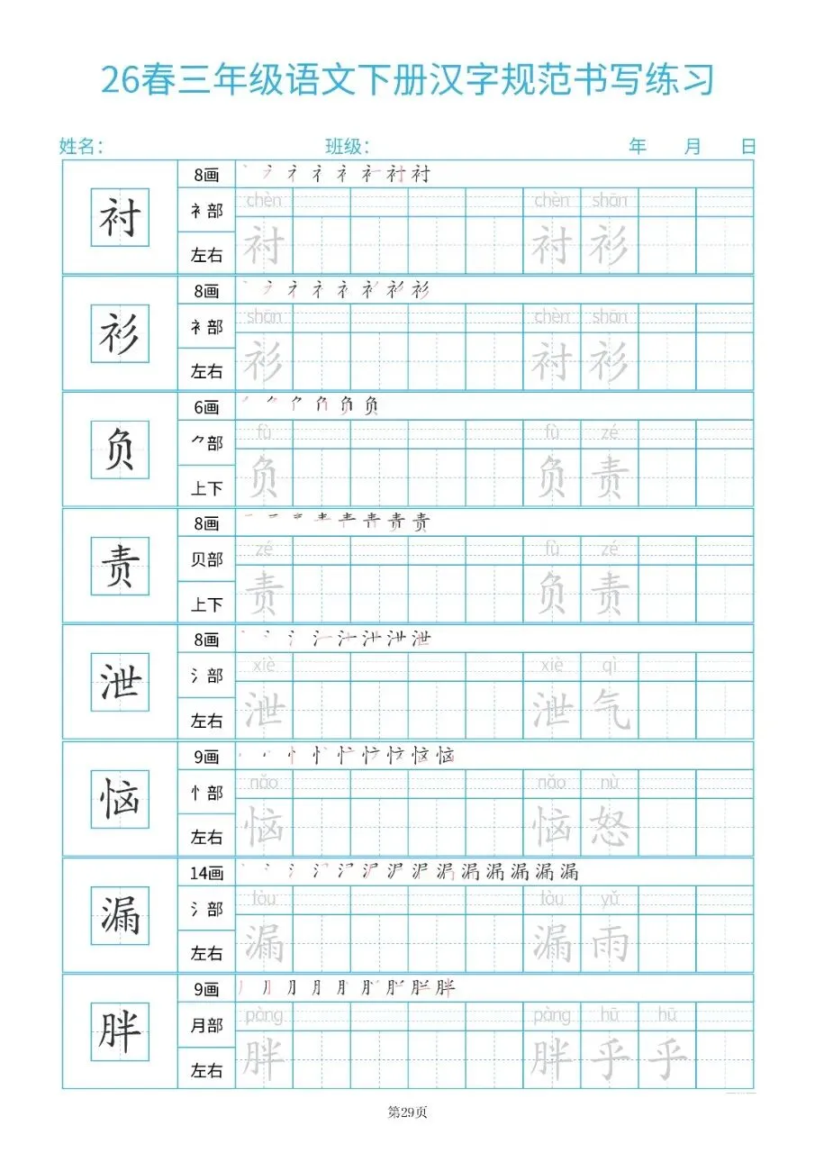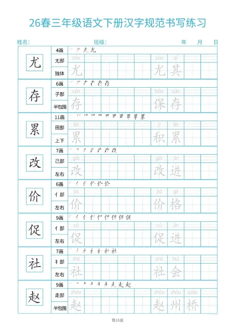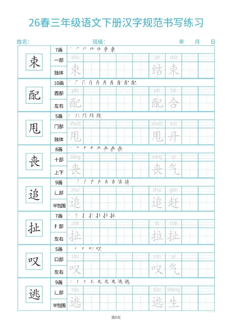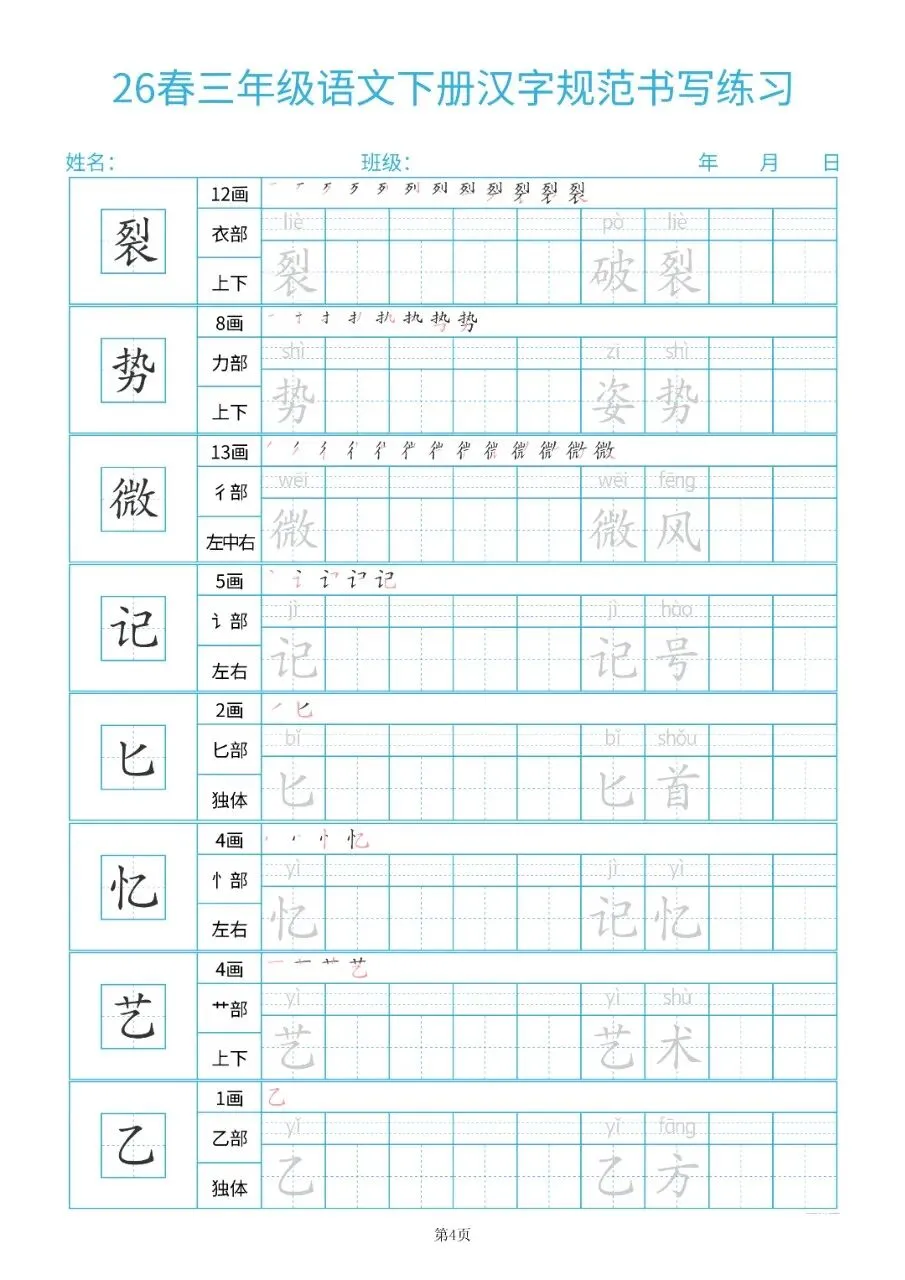 三年级必看!新版下册语文写字表字帖,电子版打印帮孩子规范书写.