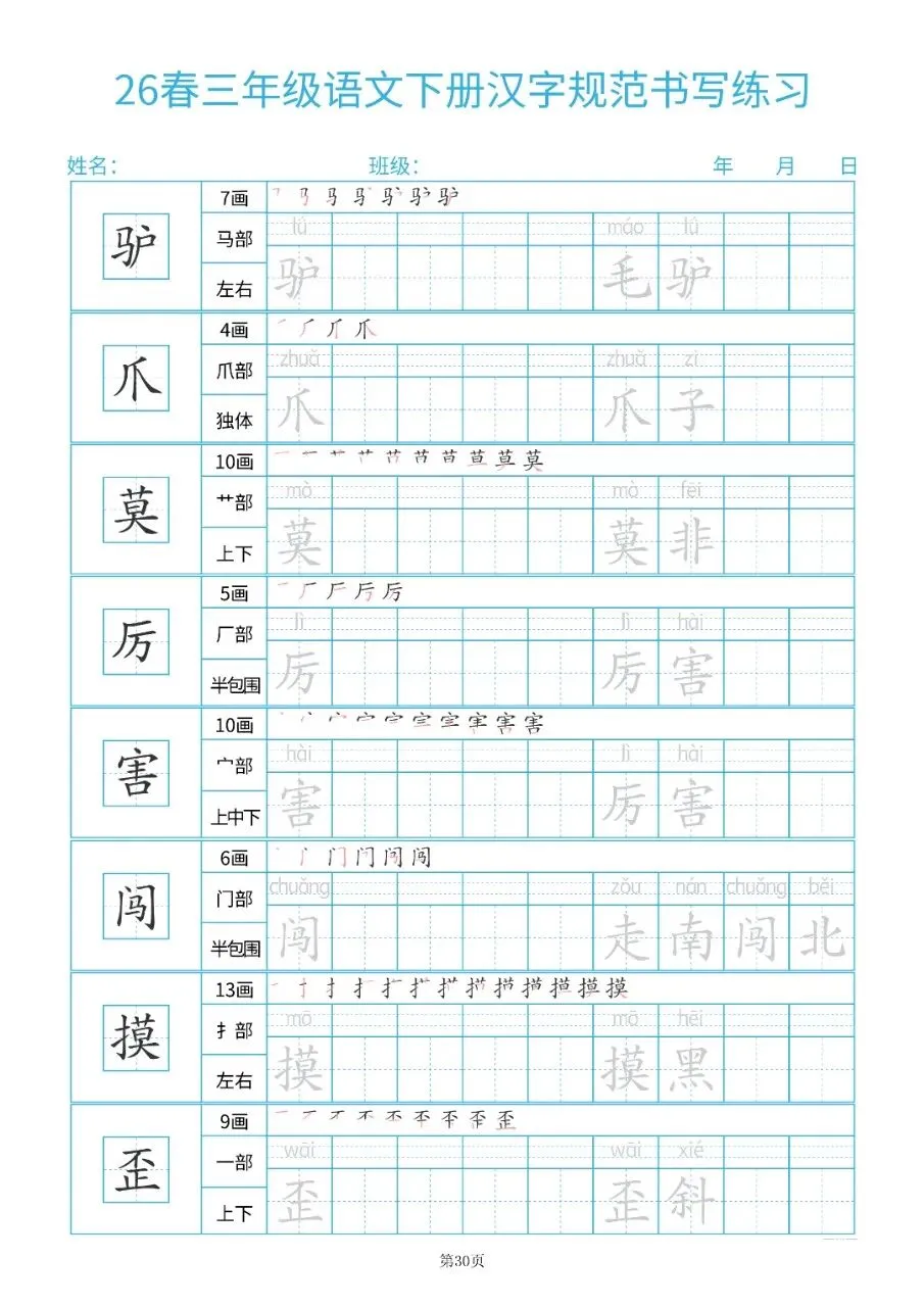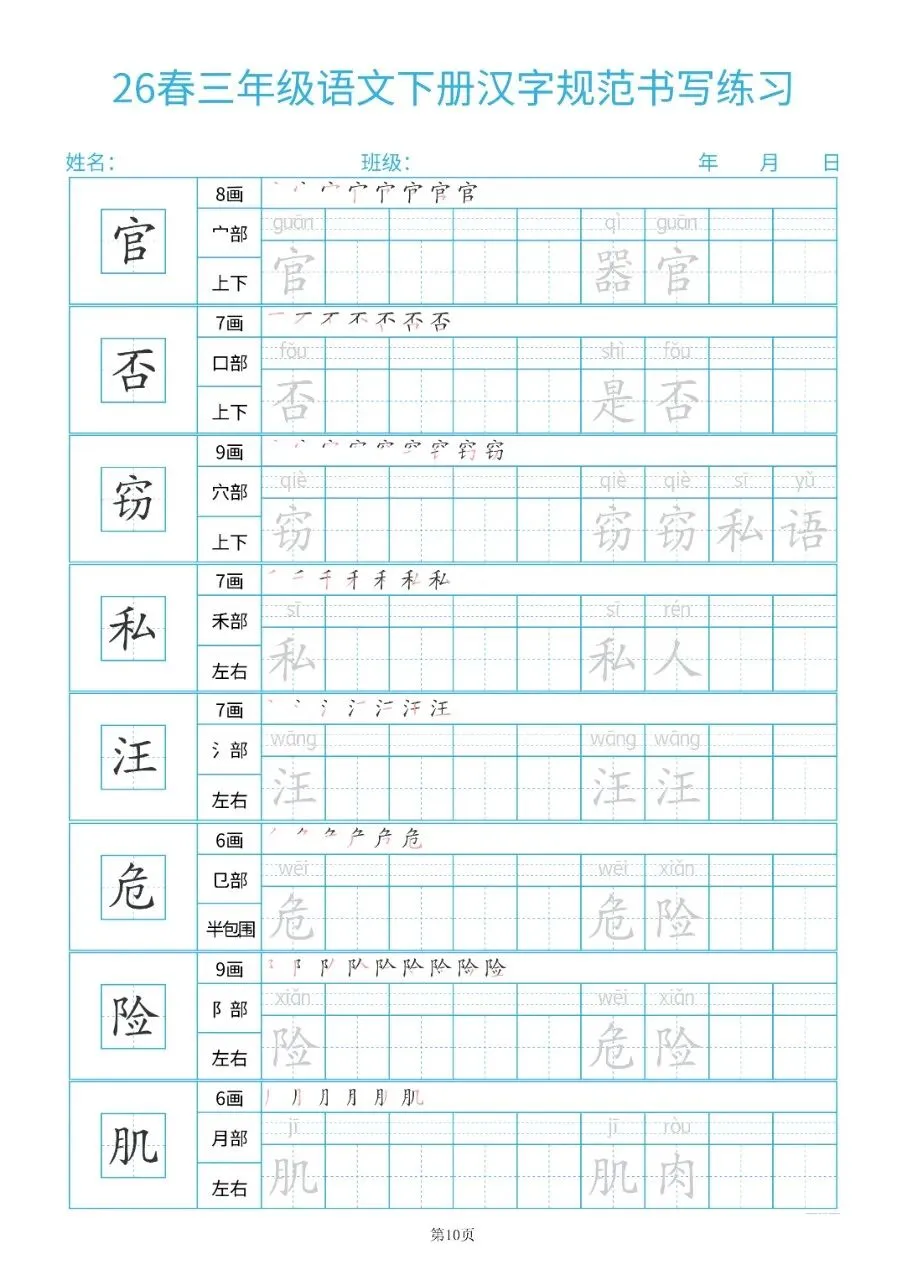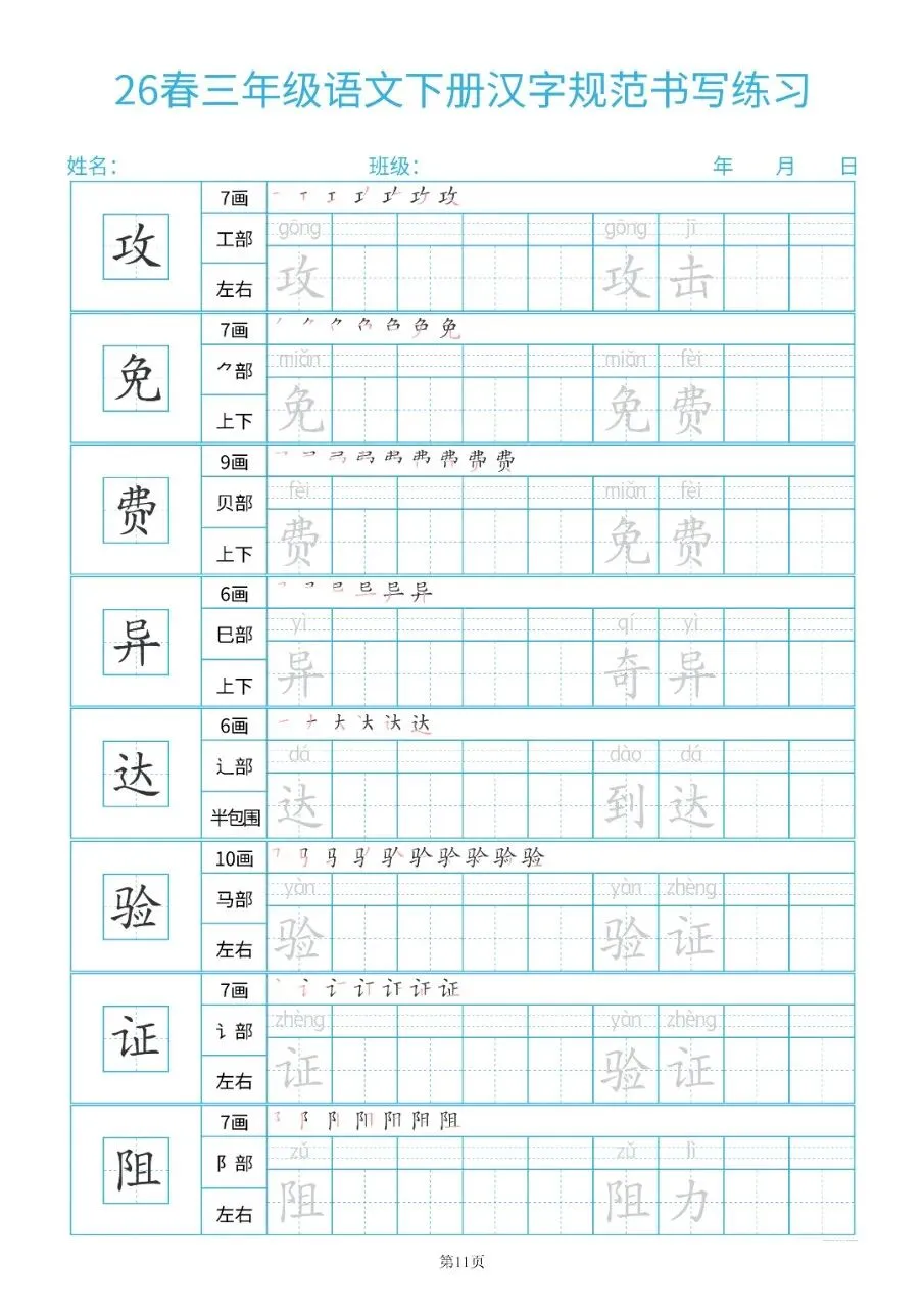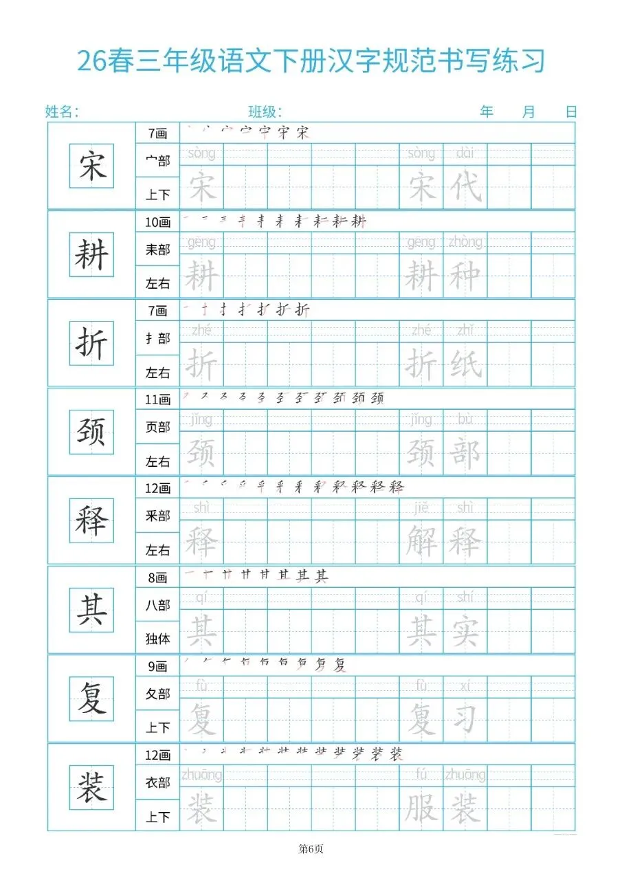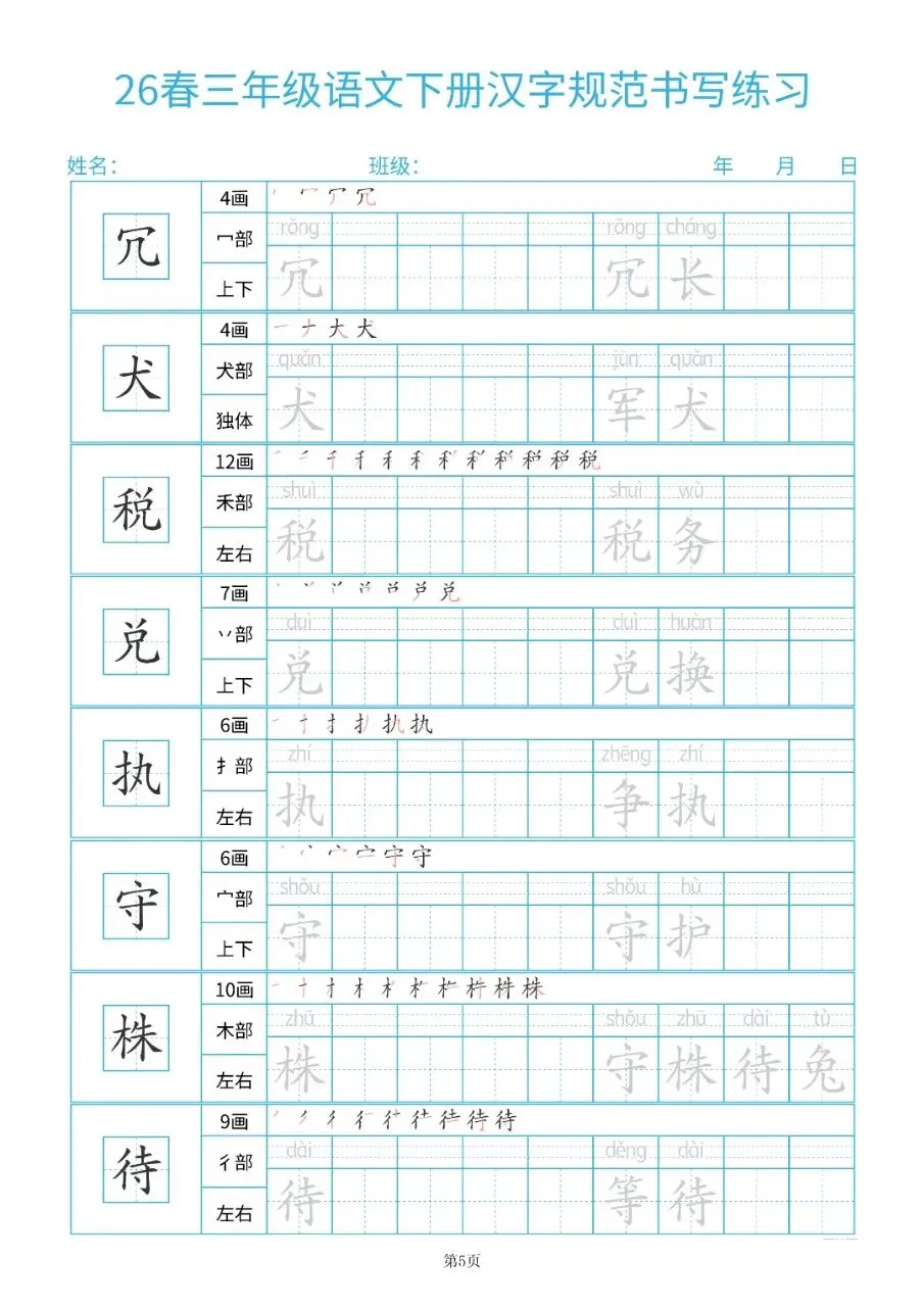 三年级必看!新版下册语文写字表字帖,电子版打印帮孩子规范书写.