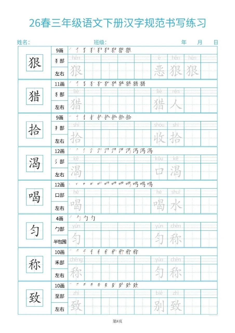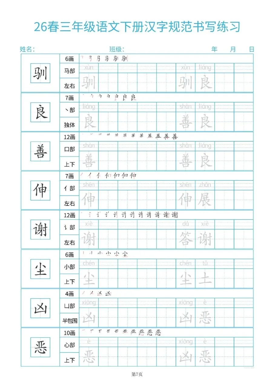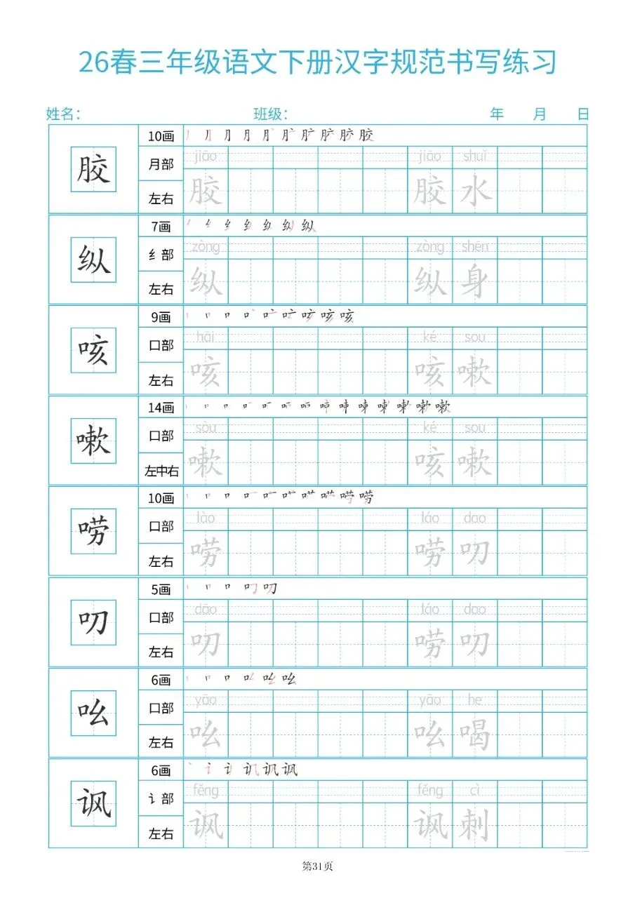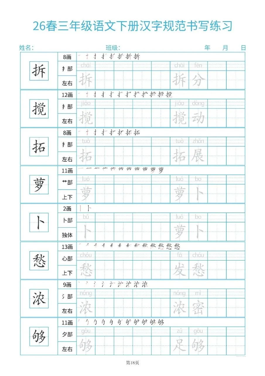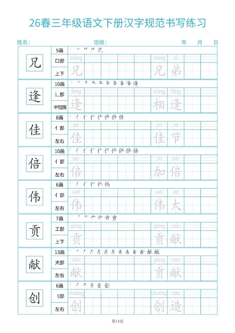三年级必看!新版下册语文写字表字帖,电子版打印帮孩子规范书写.