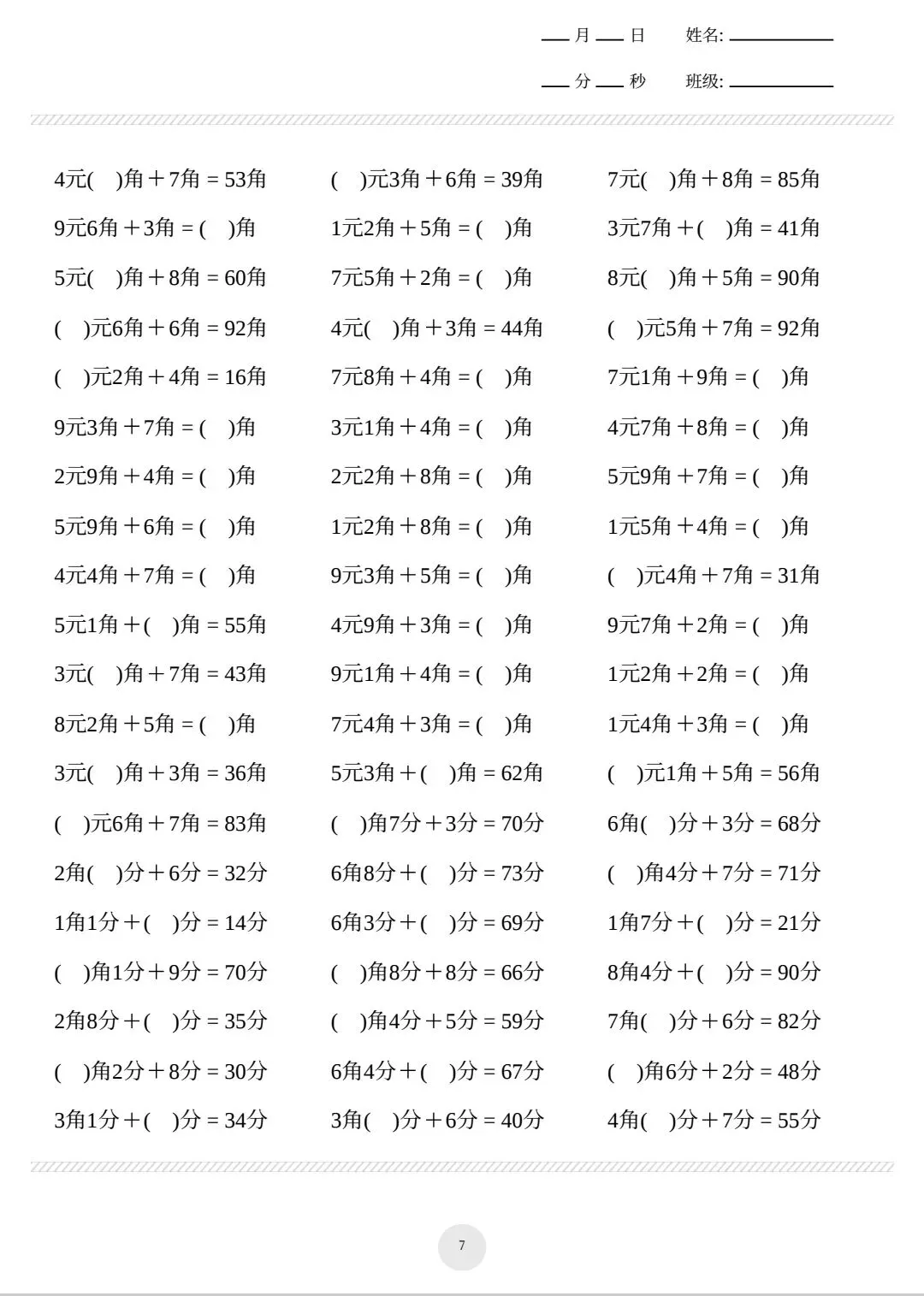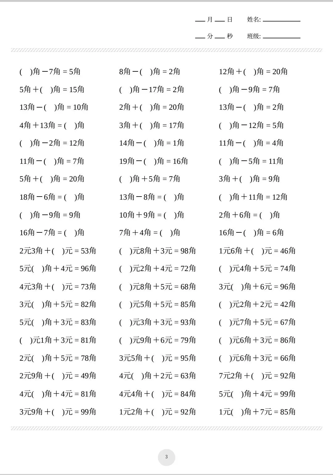26春一年级下册数学元角分计算专练电子版可打印