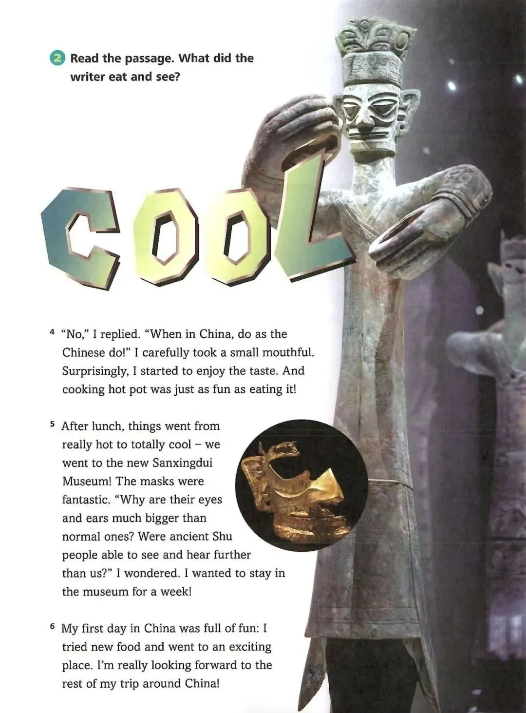 午饭后,事情从火热变得超酷——我们去了新的三星堆博物馆!那些面具太奇妙了。“为什么它们的眼睛和耳朵比正常的大得多?古蜀人是不是能比我们看得更远、听得更清呢?”我好奇极了。我真想在博物馆里待上一周!