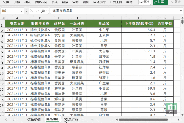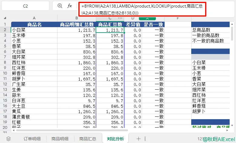 举个栗子!有份农产品出货记录表,我们需要核对商品下单数和汇总表中的总销量对不对得上。