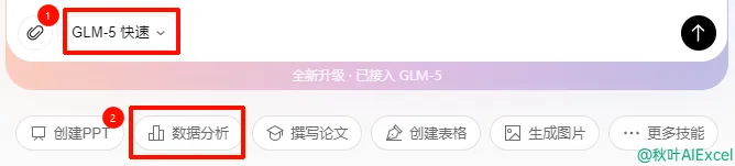 这个需求比较简单,我们选择【GLM-5 快速】就够了,接着选择【数据分析】技能。