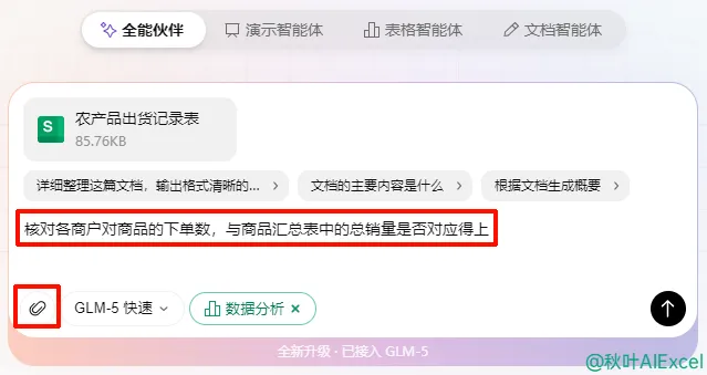 接着点击左下角的回形针图标,上传 Excel 表格,输入提示词: