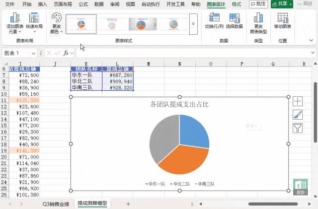 请计算每人的预估提成总额,按团队汇总后生成各团队提成支出占比的饼图,并用条件格式高亮提成排名前 3 的销售员。