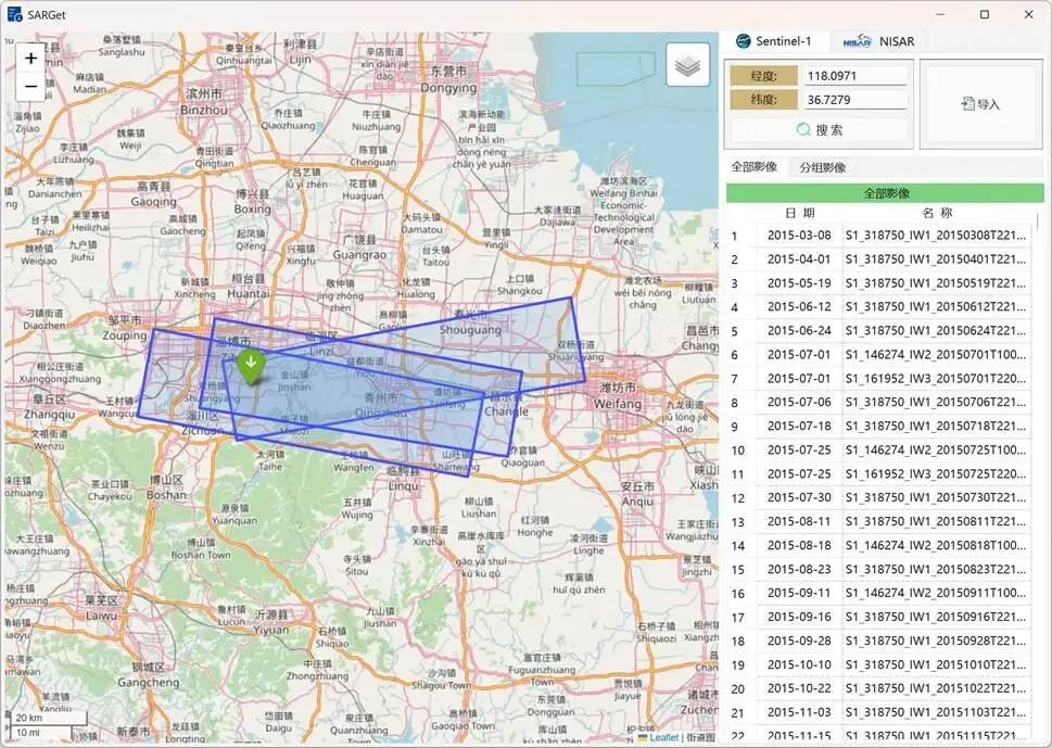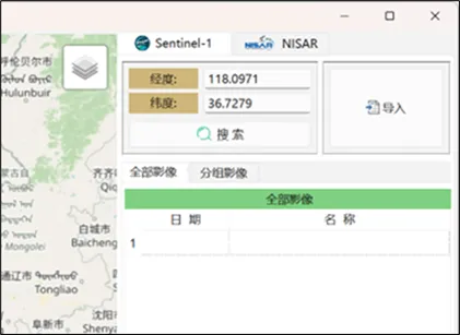 软件初始界面为Sentinel-1数据下载界面。输入研究区域的中心经纬度后,即可进行数据搜索,如图2所示。
