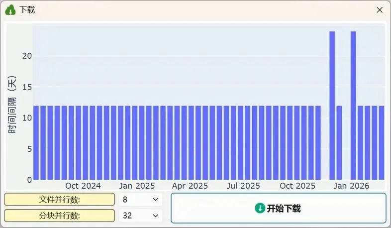 下载界面如图5所示,柱状图显示为各相邻影像的时间间隔。“文件并行数”表示并行下载的文件数;“分块并行数”表示单个文件内部的并行下载数。图5所显示的总并行数为8×32。单击“开始下载”,即可进行下载。