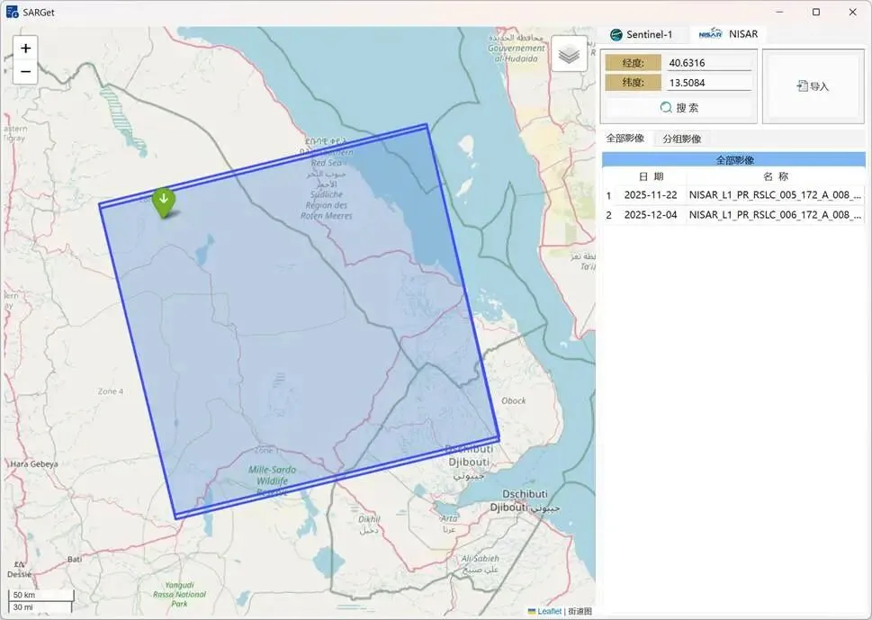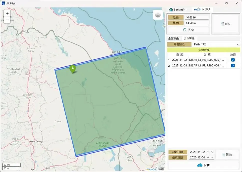 在软件主界面中,将“Sentinel-1”选项卡切换至“NISAR”选项卡,即可进行NISAR数据的搜索与下载,数据搜索方式与Sentinel-1一致,如图8所示。