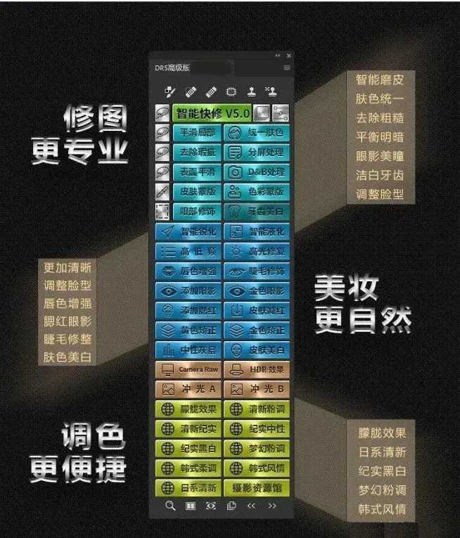 DR5.0的功能非常强大,作为Photoshop 摄影后期修图专业插件,拥有修图、磨皮、美白、塑型等30多个功能的插件,修图只需一键即可,轻松帮你搞定各种问题,快速简单为你带来更好的效果。