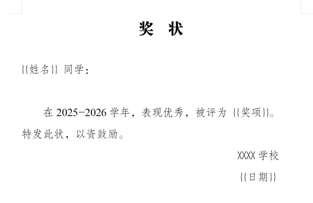 保存为 奖状模板.docx(普通Word文档就行)。