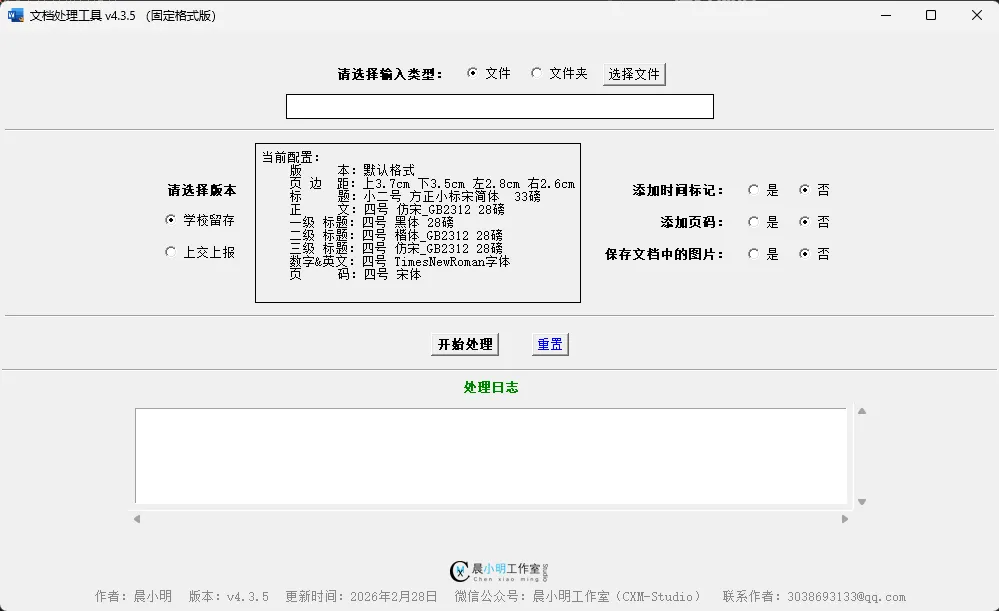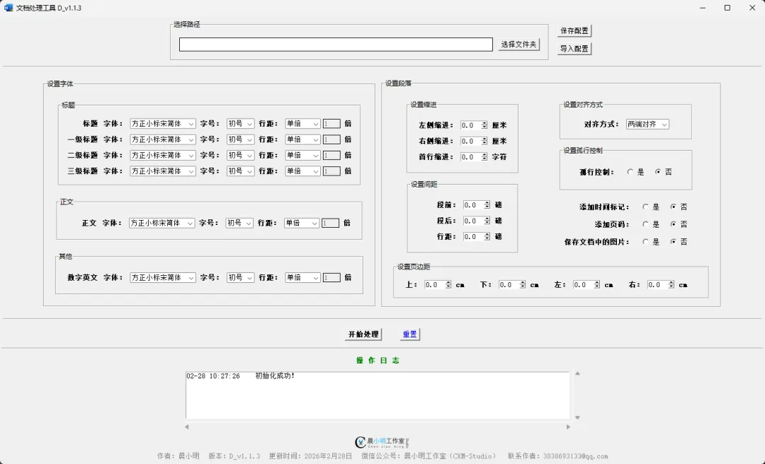 def fixWord(docx_path, file, output_path, time_ipt, page_ipt, img_ipt, version_ipt):""" 文档处理 """docx = Document(docx_path)# 页边距margin(docx)# 修改格式fixDocx(docx, version_ipt)# 添加时间后缀file_name = path.splitext(file)[0]if time_ipt == "1":save_time = strftime("%m%d%H%M", localtime())save_path = output_path + f"\{file_name}" + save_time + ".docx"else:save_time = ""save_path = output_path + f"\{file_name}" + ".docx"# 设置页码if page_ipt == "1":# 奇偶页不同docx.settings.odd_and_even_pages_header_footer = Truefooter(docx)# 保存文档中的图片if img_ipt == "1":picFix(docx, file, output_path)# 保存文档output_time = strftime("%m-%d %H:%M:%S", localtime())try:docx.save(save_path)output_txt = output_time + " " + save_pathplay_history_frm_listbox.insert(END, output_txt)play_history_frm_listbox.update()# print(f"··>提示<·· 已保存:{output_txt}")# 设置滚动条位置到最大值,即拖动到最底部play_history_frm_listbox.yview_moveto(1)return save_time, Trueexcept PermissionError:output_txt = output_time + " " + f"{file_name} 保存失败!文件已打开,请关闭后重试!"play_history_frm_listbox.insert(END, output_txt)play_history_frm_listbox.update()play_history_frm_listbox.yview_moveto(1)messagebox.showerror("错误", f"{file_name} 保存失败!文件已打开,请关闭后重试!")return save_time, False