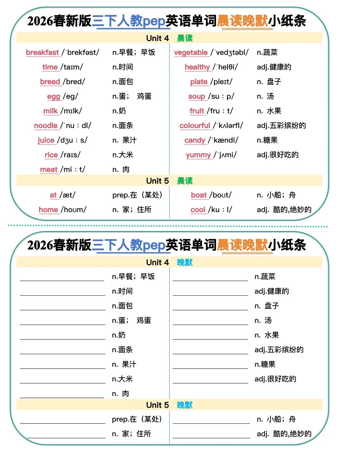 2026春新人教PEP版三年级下册英语单词表晨读晚默小纸条‖完整可打印