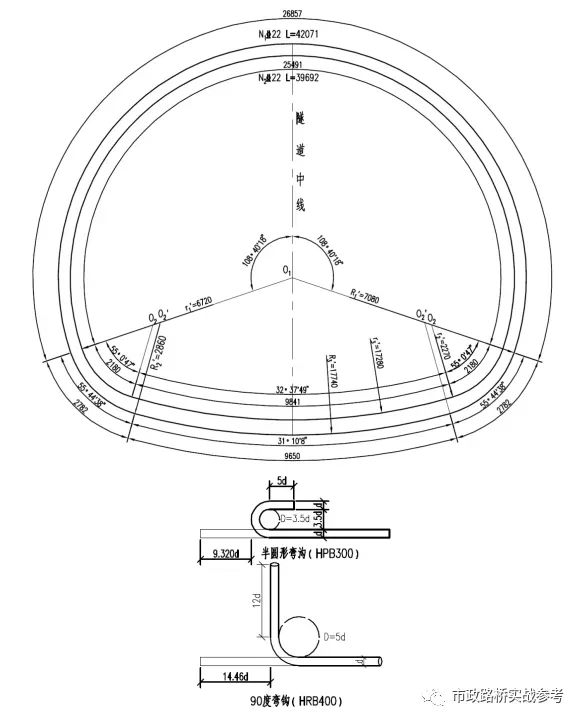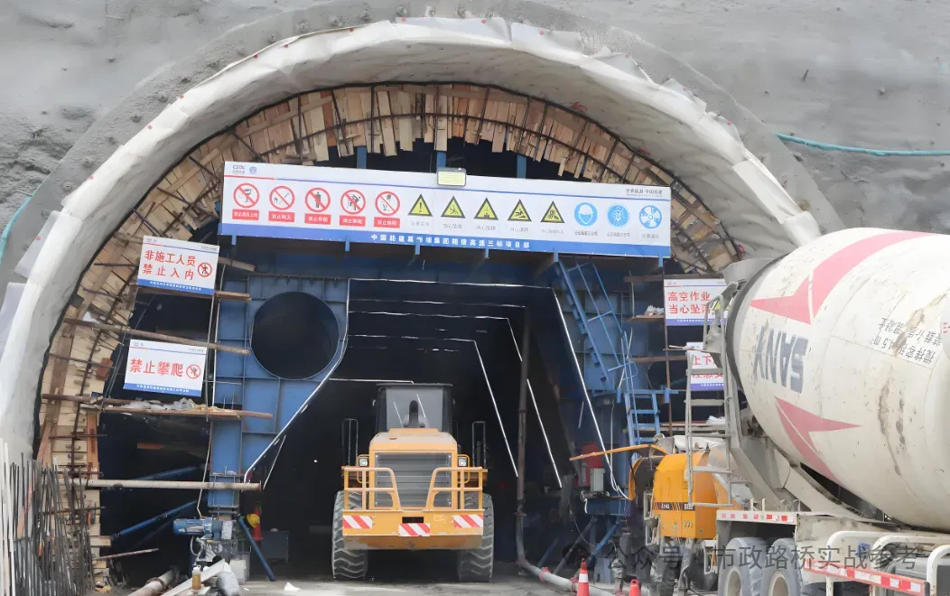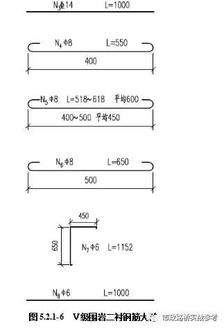 Ⅴ级围岩段采用型复合式衬砌,拱墙厚50cm、仰拱厚60cm,主筋Φ22钢筋、钢筋间距20cm,混凝土标号为C35,防水等级P10,仰拱填充每延米7.365,混凝土为C20素混凝土。