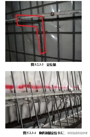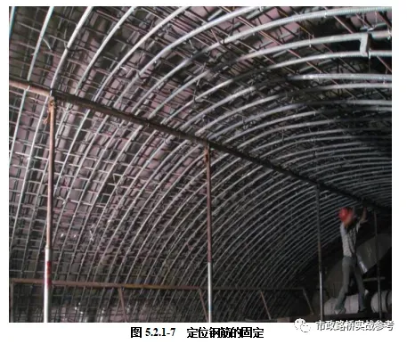 (1)测量放样定出钢筋定位筋的位置,定位钢筋固定采用自制台车上由钢管焊接的可调整的支撑杆控制。