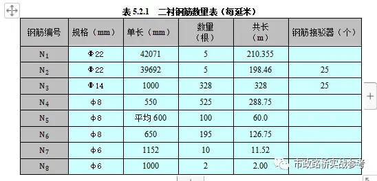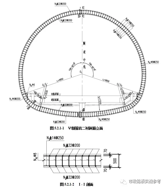 Ⅴ级围岩段采用型复合式衬砌,拱墙厚50cm、仰拱厚60cm,主筋Φ22钢筋、钢筋间距20cm,混凝土标号为C35,防水等级P10,仰拱填充每延米7.365,混凝土为C20素混凝土。