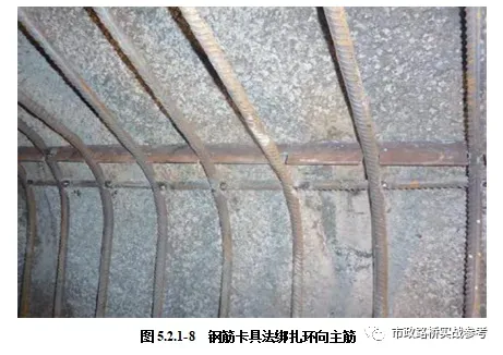 (2)定位钢筋固定好后,根据设计钢筋间距在支撑杆上用粉笔标出环向主筋布设位置(或用钢筋卡具法),在定位钢筋上标出纵向分布筋安装位置,然后开始绑扎此段范围内钢筋,各钢筋交叉处均应绑扎。