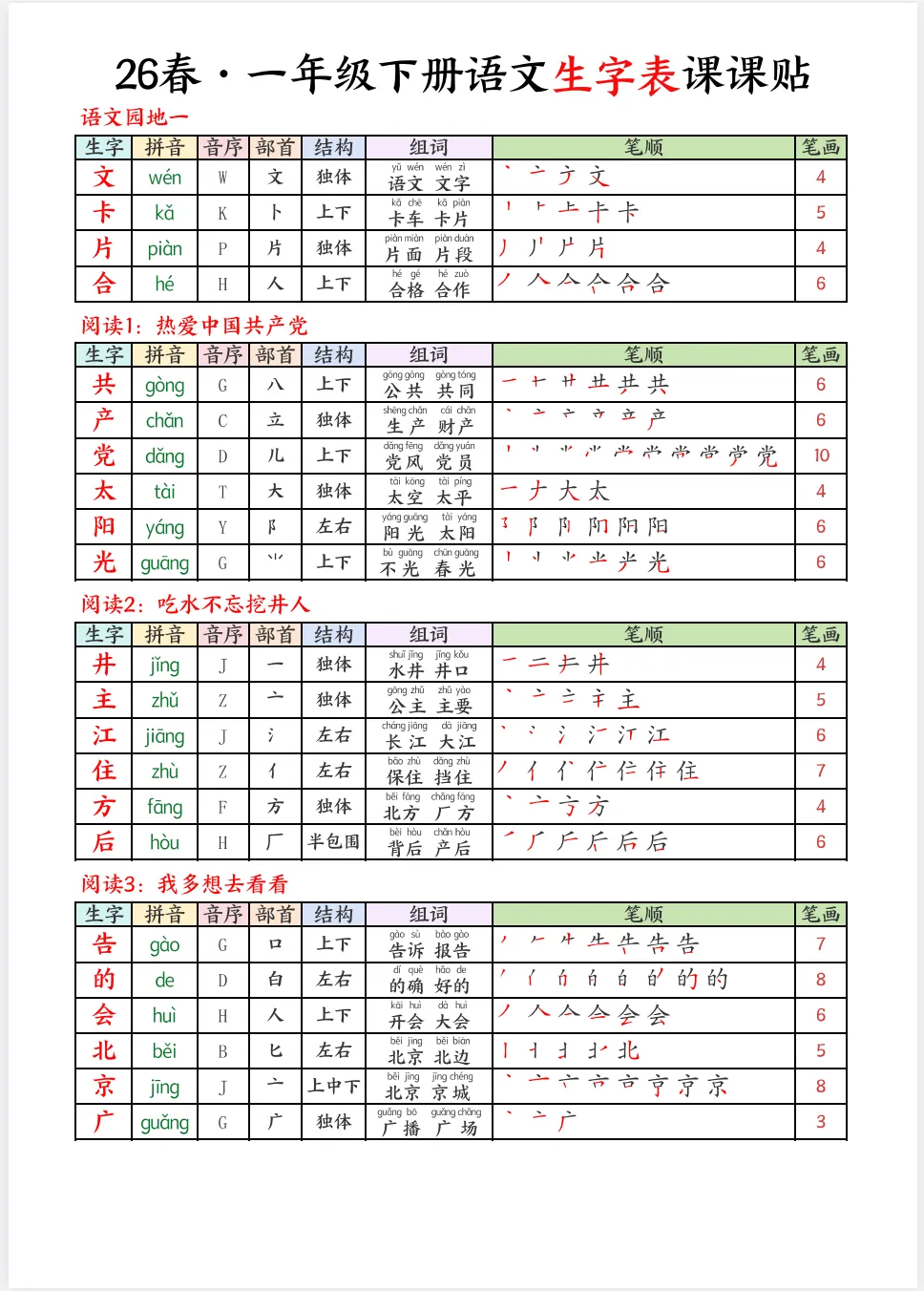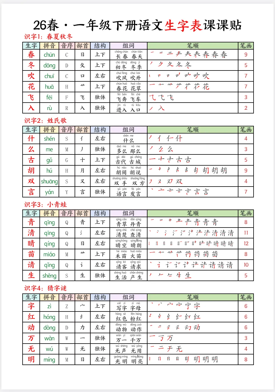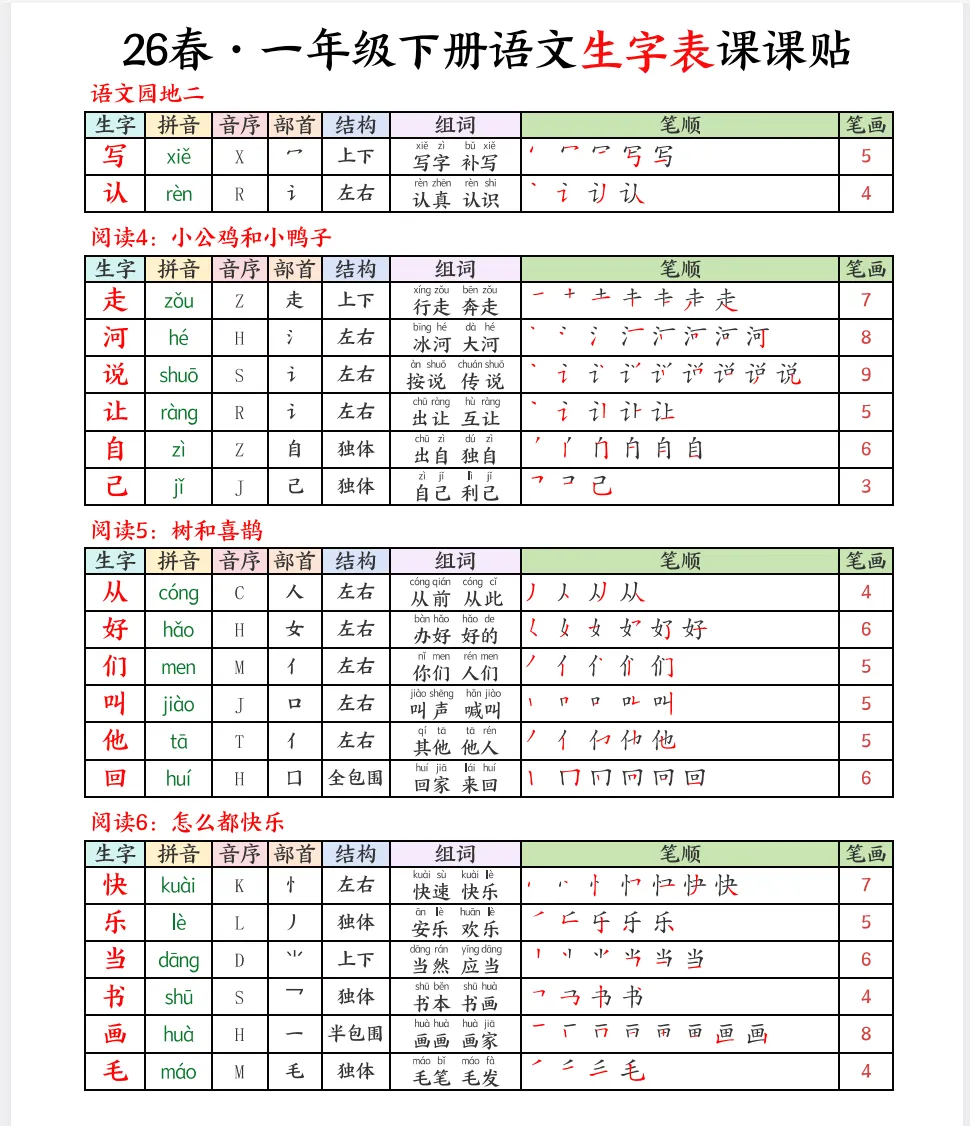 26春语文一下生字课课贴(1-6年级电子版可下载打印)