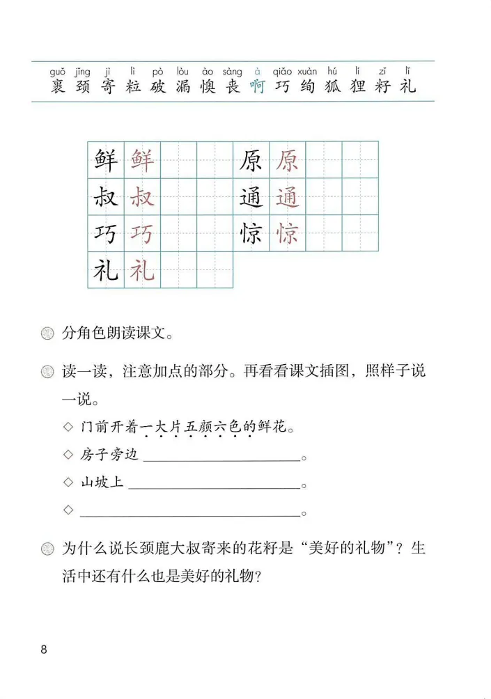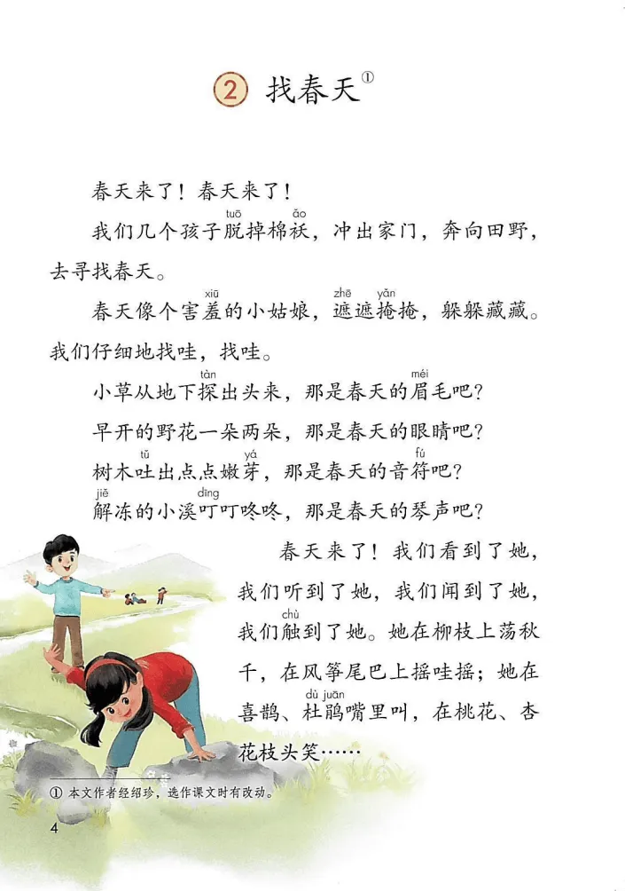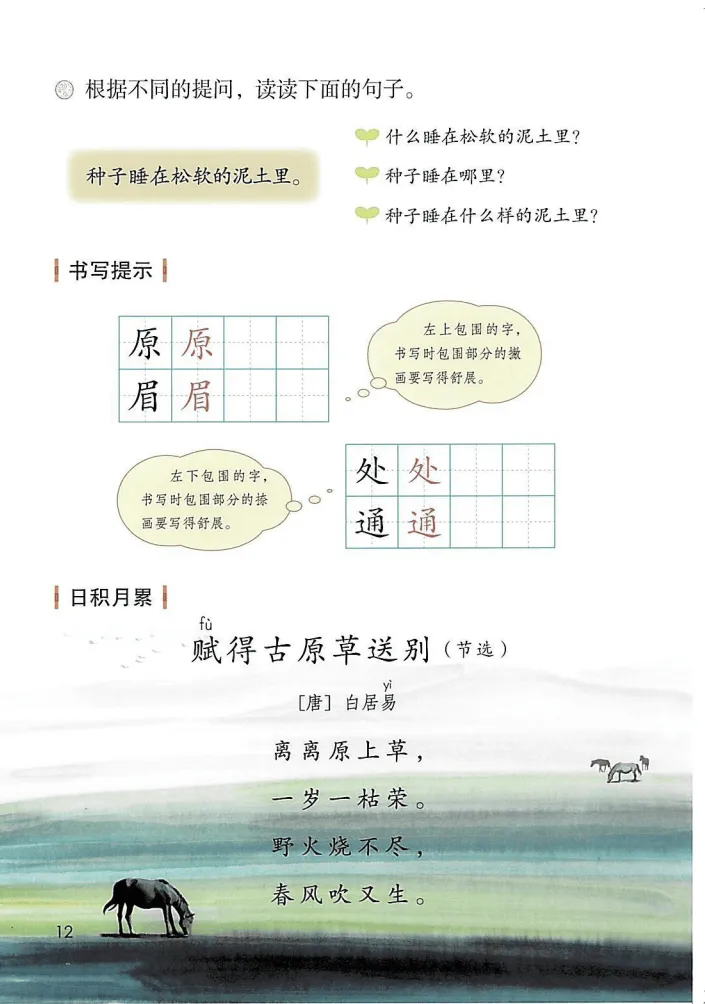 ,然后发送 电子课本 2026春新人教统编版二年级下册语文电子版课本,以“低中衔接、素养落地”为核心,优化单元架构并更新部分课文,全书共8个主题单元,前四单元聚焦基础夯实与人文启蒙,知识点贴合二年级学生认知特点,适配课前预习与课堂同步。第一单元围绕“春天的美好”主题,包含《咏柳》《村居》《找春天》等经典篇目,核心知识点为掌握“诗、碧、妆、绿”等25个会写字及“绦、裁、堤、醉”等30个会认字,背诵两首古诗及课文核心段落,积累“春风拂面、五颜六色”等四字词语与“茁壮的柏树苗、害羞的小姑娘”等短语,学会用“似、像”等词仿写比喻句,理解春天的生机与活力。第二单元以“关爱与奉献”为核心,新增课文《我不是最弱小的》,搭配《雷锋叔叔,你在哪里》《千人糕》,需熟练背诵“予人玫瑰,手有余香”等俗语,掌握“雷、锋、昨、温”等生字,区分“泥泞、晶莹”等易读错词,学会“把”字句与“被”字句转换,理解乐于助人、珍惜劳动成果的道理。第三、四单元聚焦传统文化与生活智慧,《神州谣》《传统节日》需背诵核心语句,积累祖国山川与传统节日相关词汇;《玲玲的画》《蜜蜂引路》则侧重培养问题解决能力,掌握“玲、详、蜜、蜂”等生字,学会用连续动作词语描述场景,同时通过语文园地巩固形近字辨析与词语搭配能力。