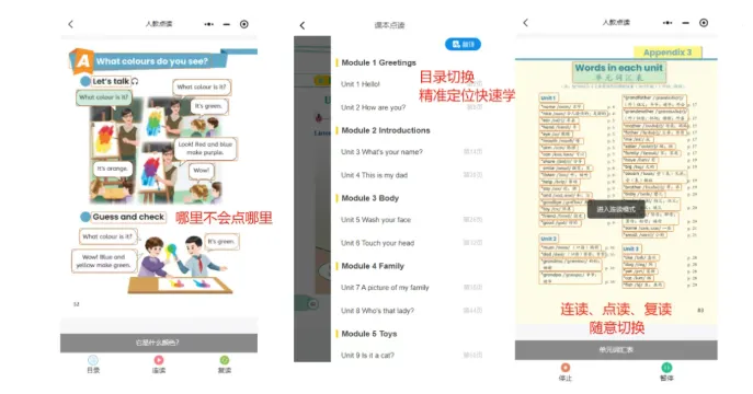 1. 电子课本点读:让预习与复习有抓手告别盲目翻书!小程序内的电子教材与纸质书排版完全一致,哪里不会点哪里。课前用它磨耳朵了解新知,课后用它回顾重难点,帮孩子迅速搭建起知识框架,扫清生词障碍。