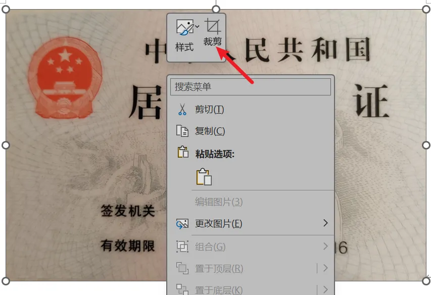 右键点击图片,选择「裁剪」,拖动黑边去掉多余背景,只保留证件区域。