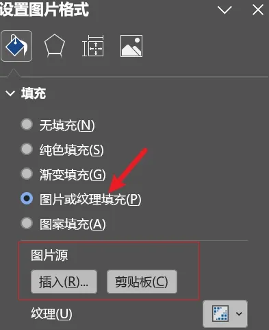 右侧会弹出设置窗口,找到「填充」→ 选择「图片或纹理填充」。