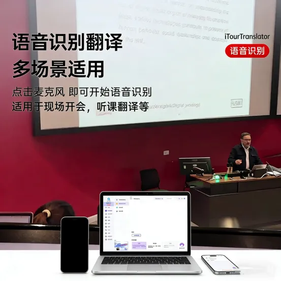 •语音识别:适用于听课、国际会议、讲座等长时间需要听译的场景。软件可不间断实时翻译,将对方语音转为双语字幕显示,用户发言时则自动切换为翻译播报模式。