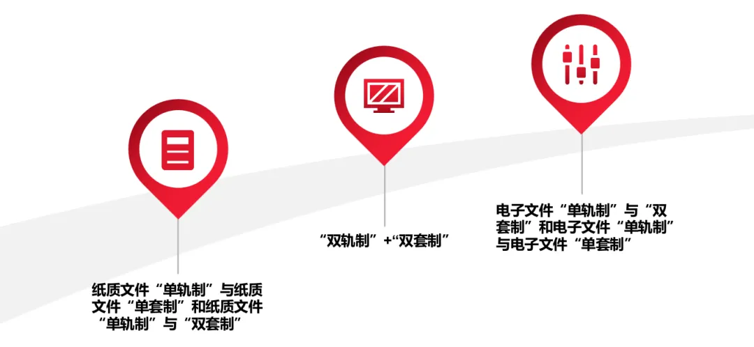 文件的起草、审核、签发、传递、阅办以及接收、查询、存档、利用等都要运用计算机和网络技术来实现,电子文件管理流程、电子文件管理系统与纸质文件管理流程、纸质文件管理系统并行存在。“双轨制”意味着纸质文件与电子文件长期并存,双轨运行,即两种版本文件同步随业务流程运转。