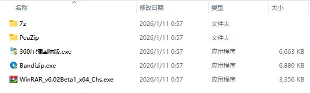 包括7-Zip、PeaZip、360压缩国际版(无广无毒版)、WinRAR、Bandizip。