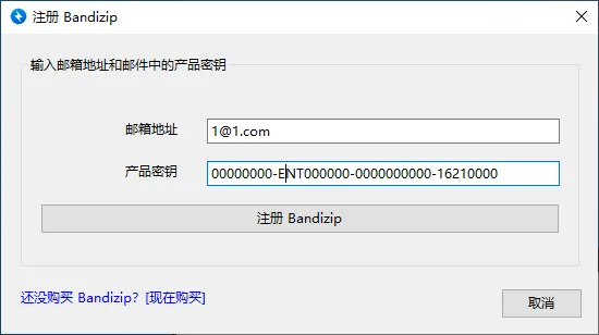 输入产品秘钥:00000000-ENT000000-0000000000-16210000 点击【注册bandzip】