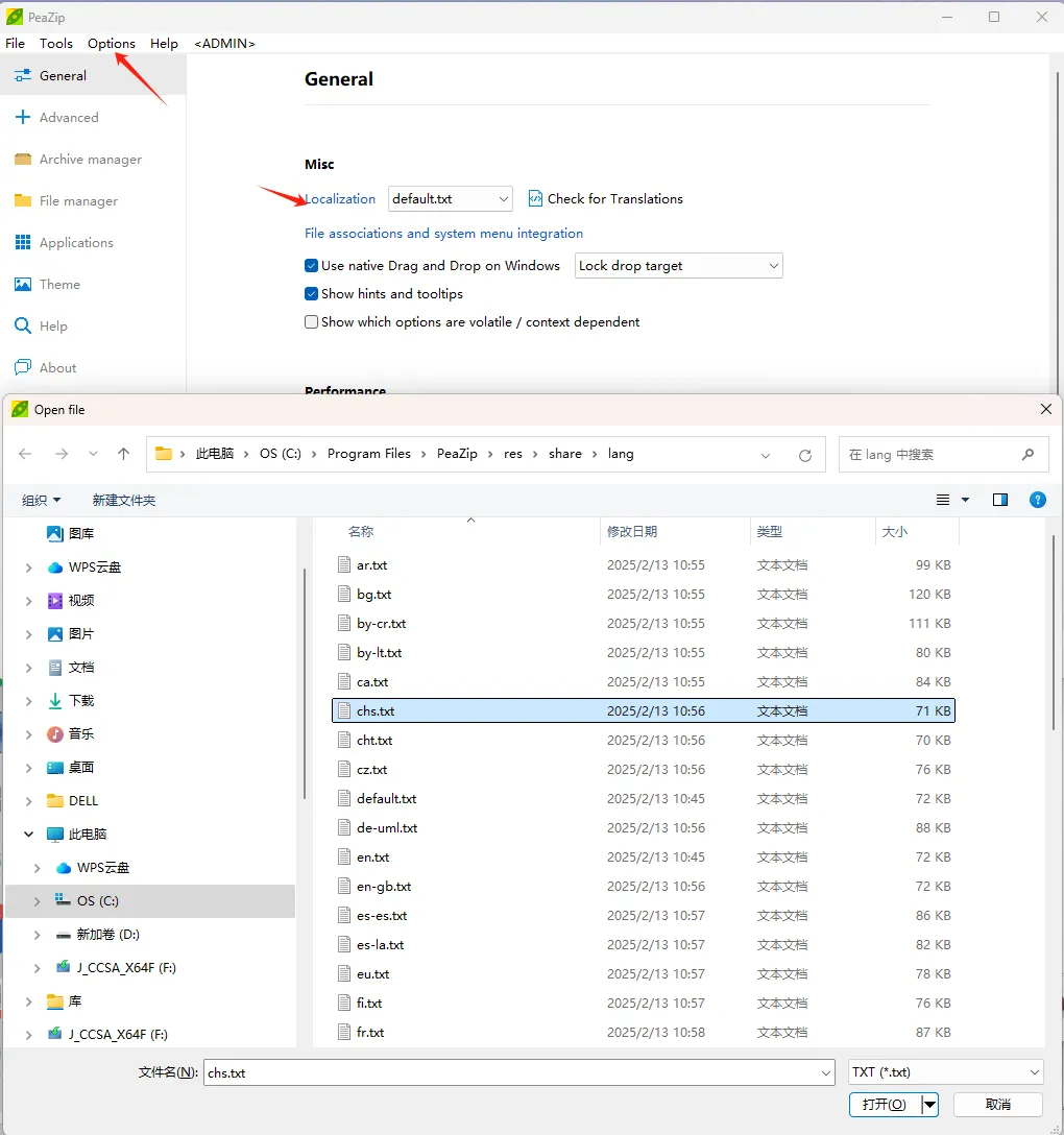 安装PeaZip成功之后,还需要设置语言为【中文】。
