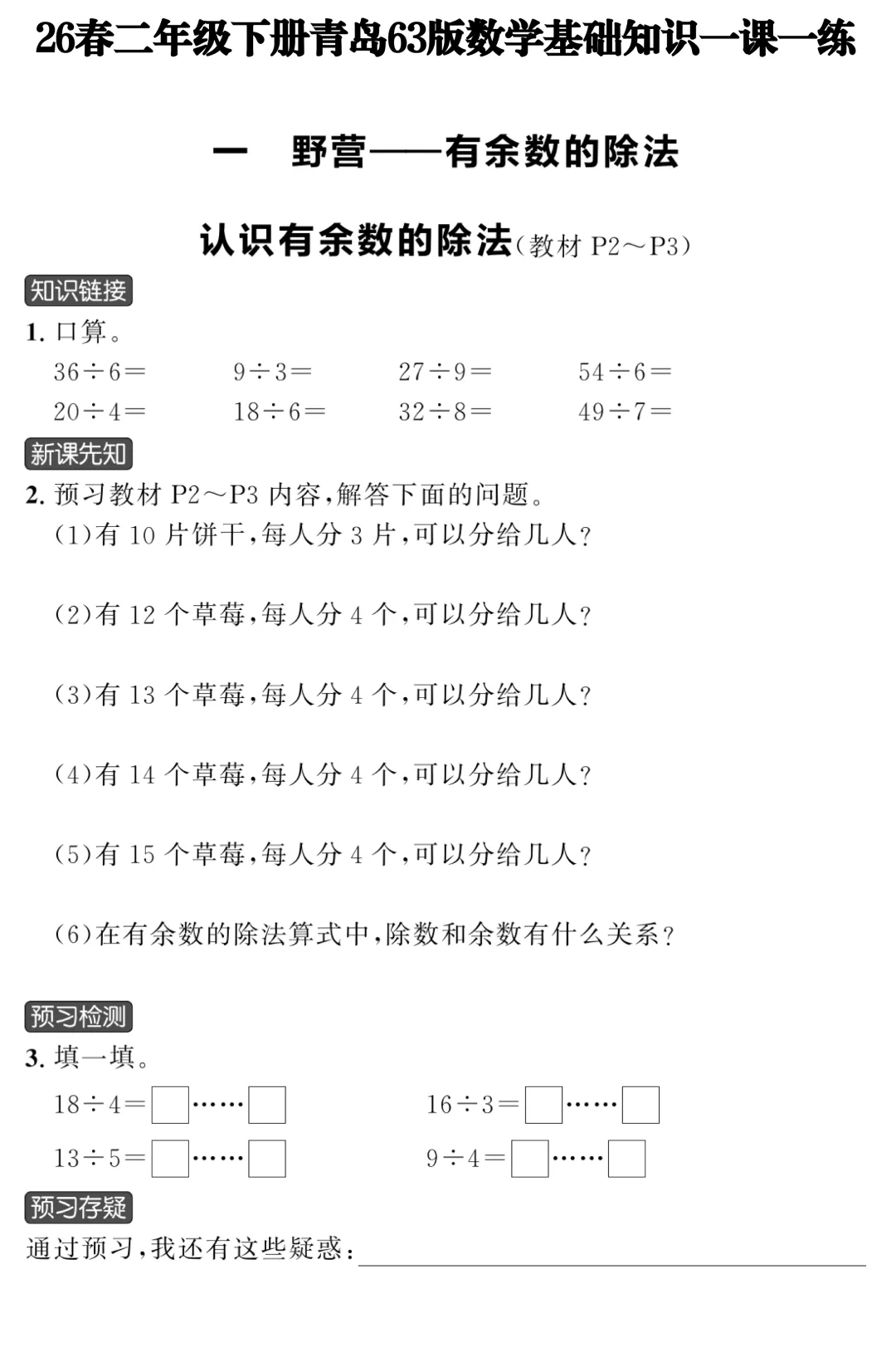 二年级宝妈速存👀【免费资料】26 春二年级下册青岛 63 版数学《基础知识一课一练含答案》来啦✅