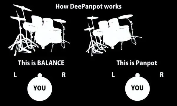 DeePanpot 的设计目的是控制立体声源的声像定位而不是平衡,并添加了“哈斯效应”,旨在提供“更真实的声像定位”。他们提供这张图片来说明 DeePanpot 的不同之处。