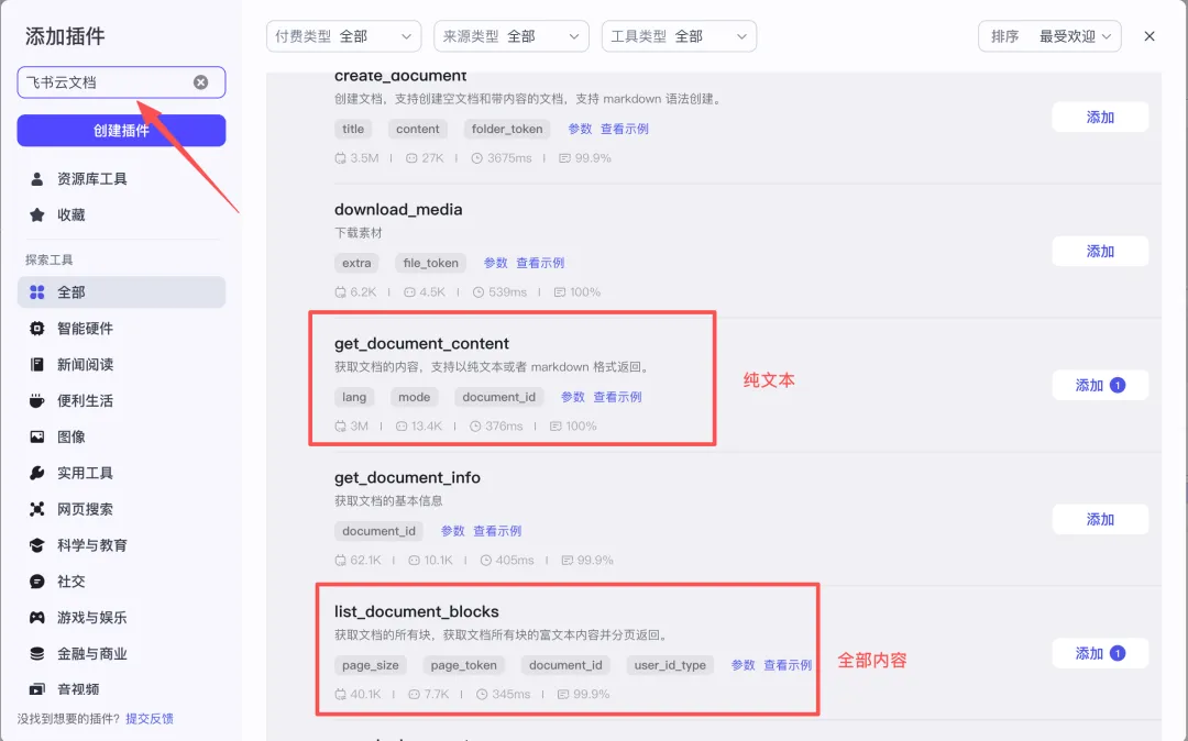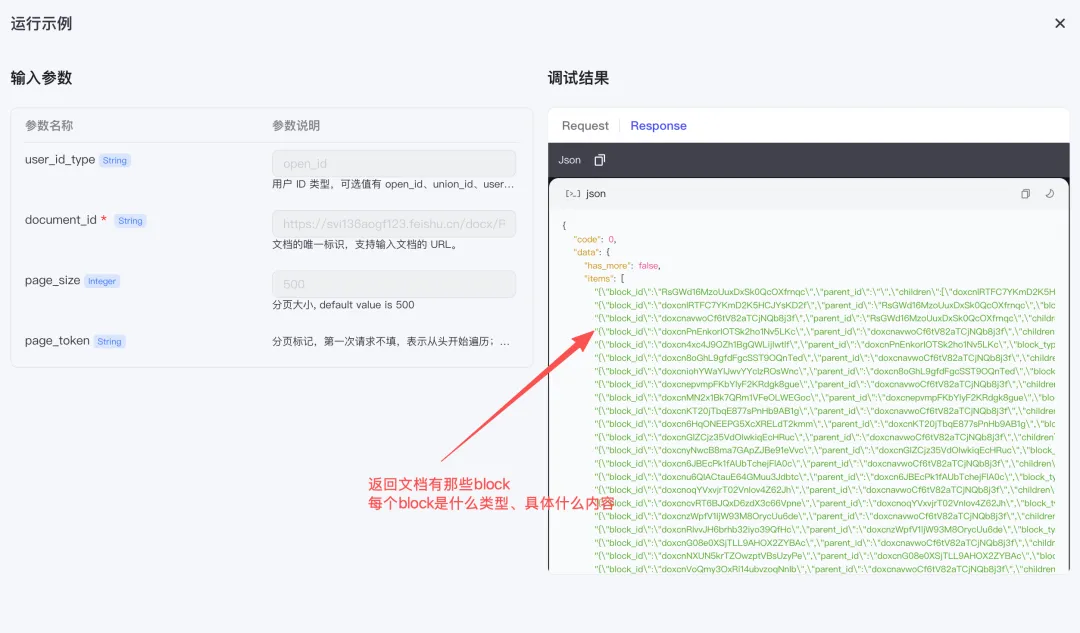 飞书的API使用上述两个,get_document_content返回纯文本的Markdown格式内容,作为摘要、图片生成的提示词;list_document_blocks返回是文档的block结构,是一个文档的全部块结构。
