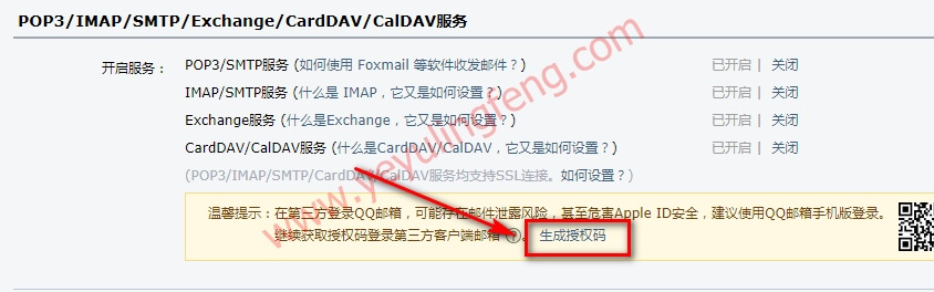 如果是新浪邮箱和阿里云邮箱,授权码就是登录密码。这里老夜是以QQ邮箱来进行测试的,需要找到POP3/IMAP/SMTP/Exchange/CardDAV/CalDAV服务的授权码,一般在设置 — 账户中就能找到,如下图所示: