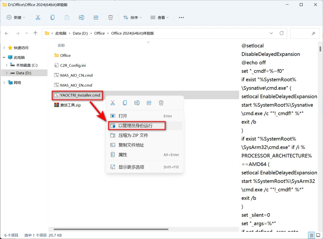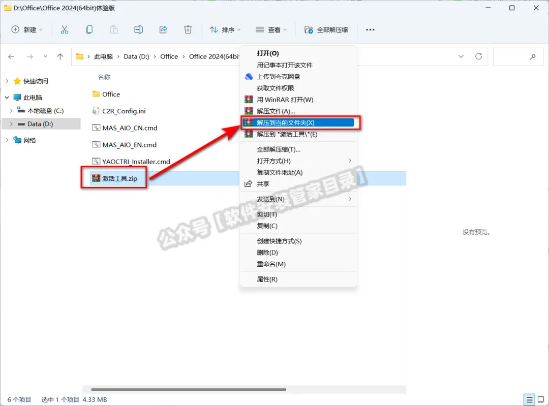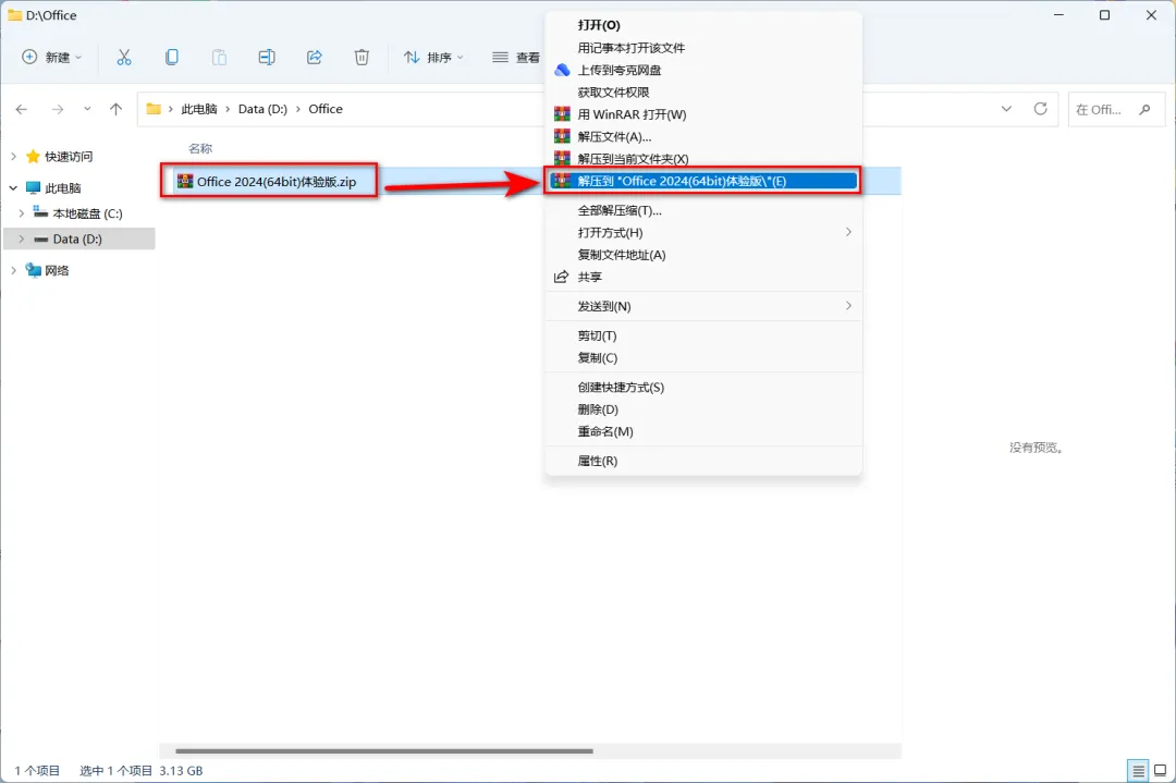 1、鼠标右键【Office 2024(64bit)体验版】安装包,解压到文件夹。