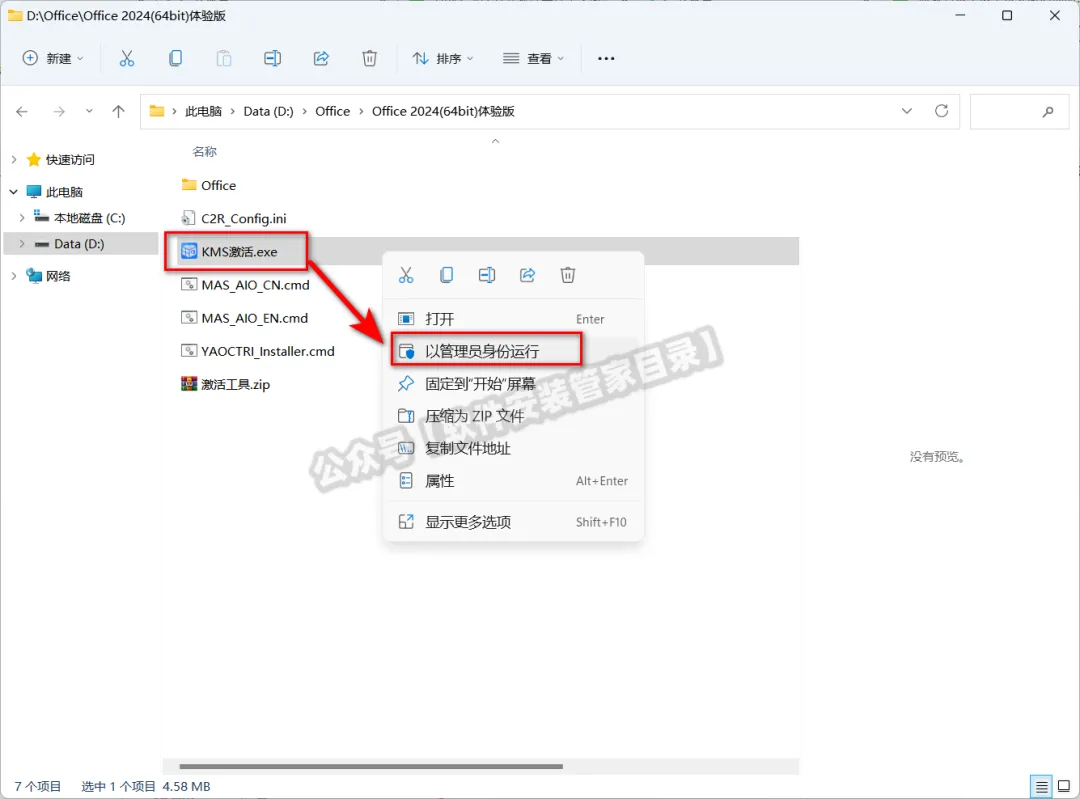 7、鼠标右键解压出来的【KMS激活】程序,选择【以管理员身份运行】。