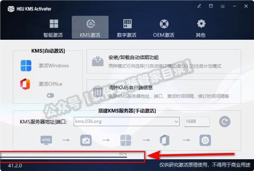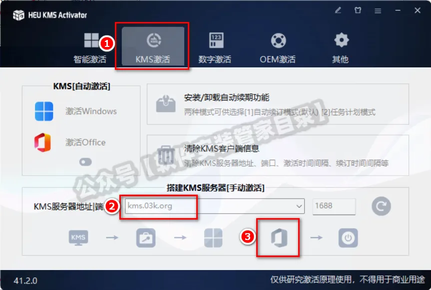 9、①点击【KMS激活】;②在服务器地址中输入【kms.03k.org】;③点击【office图标】。