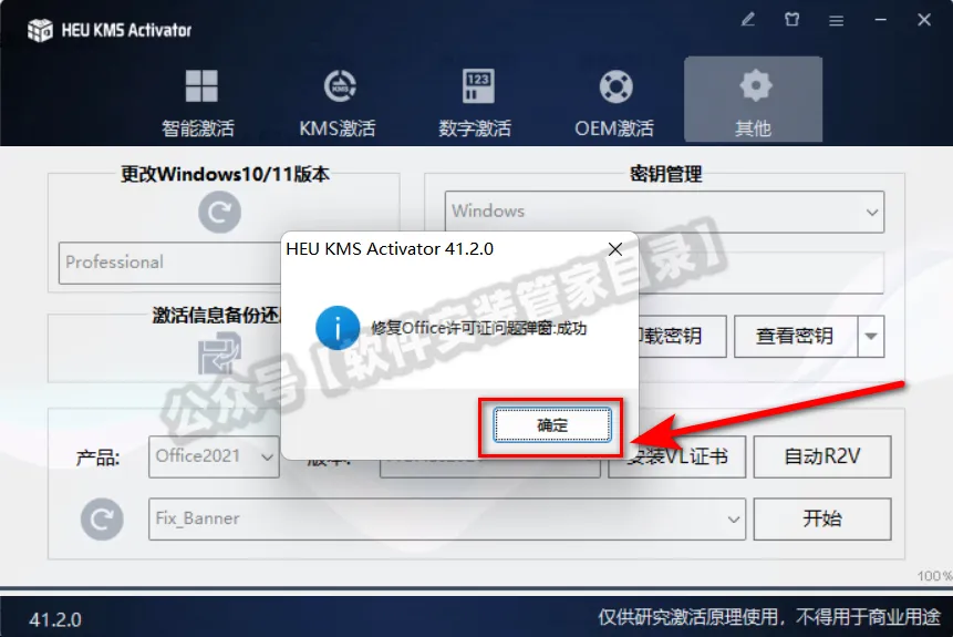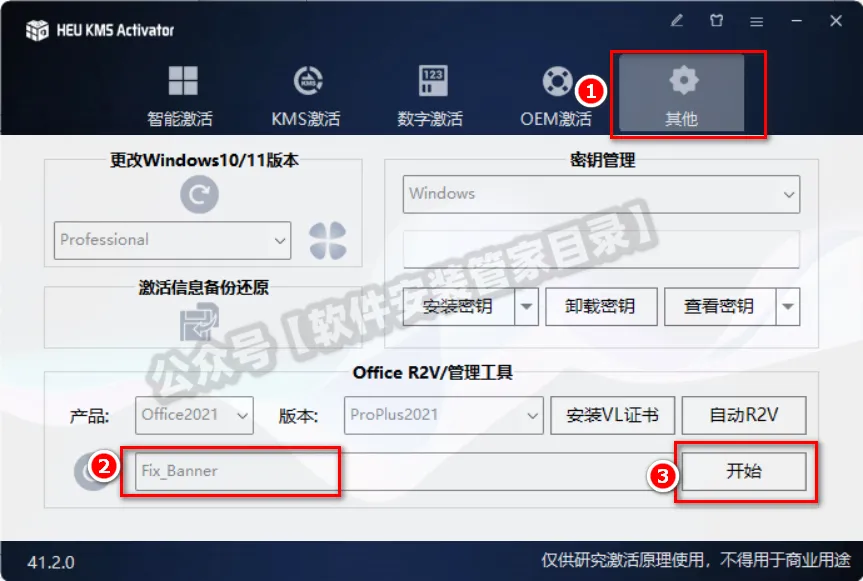 12、激活成功后部分电脑Office可能会弹出盗版弹窗,继续按下面的教程操作。 回到【KMS激活】工具界面:①点击【其他】;②选择下图框中的【Fix_Banner】; ③点击【开始】。