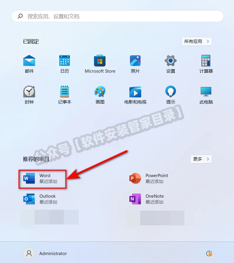 14、在电脑【开始】菜单打开一个Office产品,例如【Word】。